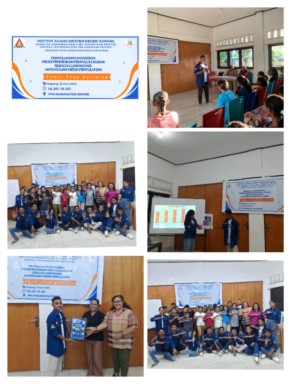 IAKN Kupang (Kemenag) – – – Dalam upaya menanggulangi permasalahan bullying yang masih menjadi ancaman serius di kalangan pelajar, mahasiswa Program Studi Pendidikan Penyuluh Agama (PPA) dari Jurusan Pendidikan Seni dan Konseling Kristen, Fakultas Keguruan dan Ilmu Pendidikan Kristen, Institut Agama Kristen Negeri (IAKN) Kupang, menggelar kegiatan penyuluhan bertajuk “Stop Bullying” pada Rabu (12/06/2024) sebagai luaran dari Mata Kuliah Media Penyuluhan dengan dosen pengampuh, Merling T.L.L.C Messakh, M.Pd.