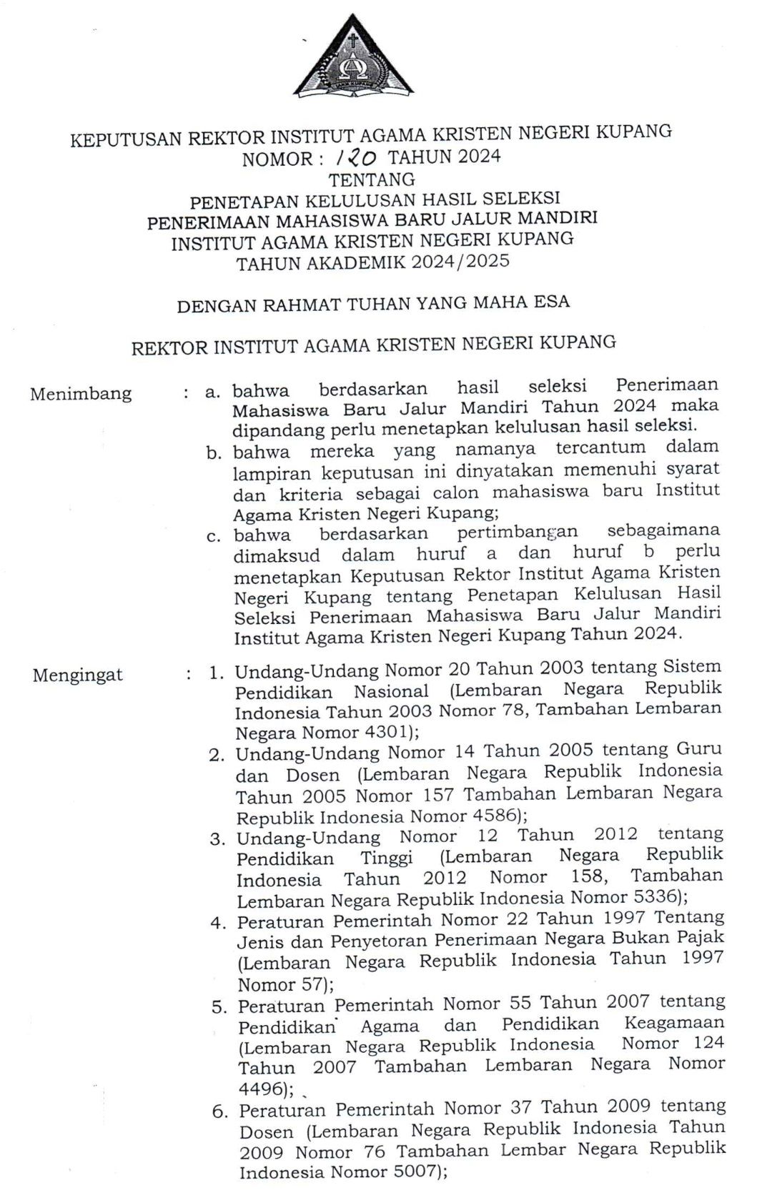 Penetapan Kelulusan Hasil Seleksi Penerimaan Mahasiswa Baru Jalur Mandiri Tahun 2024 31 Juli 2024 16:11 WITA | IAKN Kupang | Berita Kampus Previous Next Klik di sini untuk melihat SK Pengumuman dan Lampiran Nama-nama yang lulus Silakan Ikuti IAKN Kupang di Social Media Post navigation Sebelumnya: Pengumuman Registrasi Semester Ganjil Tahun Akademik 2024/2025Selanjutnya: Pengumuman Penerimaan Mahasiswa Baru 2024 Gelombang ke-2 Pada 2 Fakultas Berita Kampus Lainnya Dekan FISKK IAKN Kupang Ajak Civitas Akademika Jaga Produktivitas dan Sinergi dalam Pelayanan 12/11/2024 IAKN Kupang Gelar Upacara Hari Pahlawan, Ajak Civitas Akademika Teladani Semangat Kepahlawanan 12/11/2024 IAKN Kupang Perkuat Kolaborasi Pendidikan Internasional dengan Taiwan 12/11/2024 IAKN Kupang Apresiasi Mahasiswa Berprestasi, Endi Missa Peraih Emas PEPARNAS XVII 11/11/2024 Pengumuman Perpanjangan Pendaftaran Wisuda Tahap II Tahun 2024 04/11/2024 Rektor IAKN Kupang Tekankan 5 Pilar Mentalitas: Membangun SDM Unggul Bersama Pemkab Kupang 31/10/2024 Audiensi IAKN Kupang dan Pemkab Kupang: Sinergi Membangun SDM Unggul dan Kampus Berintegritas 31/10/2024 IAKN Kupang Jalin Kerja Sama dengan Gwacheon Cultural Center, Korea Selatan 30/10/2024 IAKN Kupang Gelar Seminar Nasional Psikologi: Membangun Resiliensi Mental di Era Society 5.0 30/10/2024 Seminar ‘Fatherless: The Way to Find Yourself’ Dorong Pencarian Jati Diri di Tengah Kehilangan Figur Ayah 30/10/2024 Kategori Acara & Tulisan IlmiahBerita KampusSEKILAS IAKN KUPANG Berita Terbaru IAKN Kupang Gelar Ibadah Awal Pekan: Ajak Civitas Akademika Renungkan Orientasi Kerja dalam Iman 12/11/2024 Acara & Tulisan Ilmiah Baca selengkapnya Dekan FISKK IAKN Kupang Ajak Civitas Akademika Jaga Produktivitas dan Sinergi dalam Pelayanan 12/11/2024 Berita Kampus Baca selengkapnya IAKN Kupang Gelar Upacara Hari Pahlawan, Ajak Civitas Akademika Teladani Semangat Kepahlawanan 12/11/2024 Berita Kampus Baca selengkapnya IAKN Kupang Perkuat Kolaborasi Pendidikan Internasional dengan Taiwan 12/11/2024 Berita Kampus Baca selengkapnya