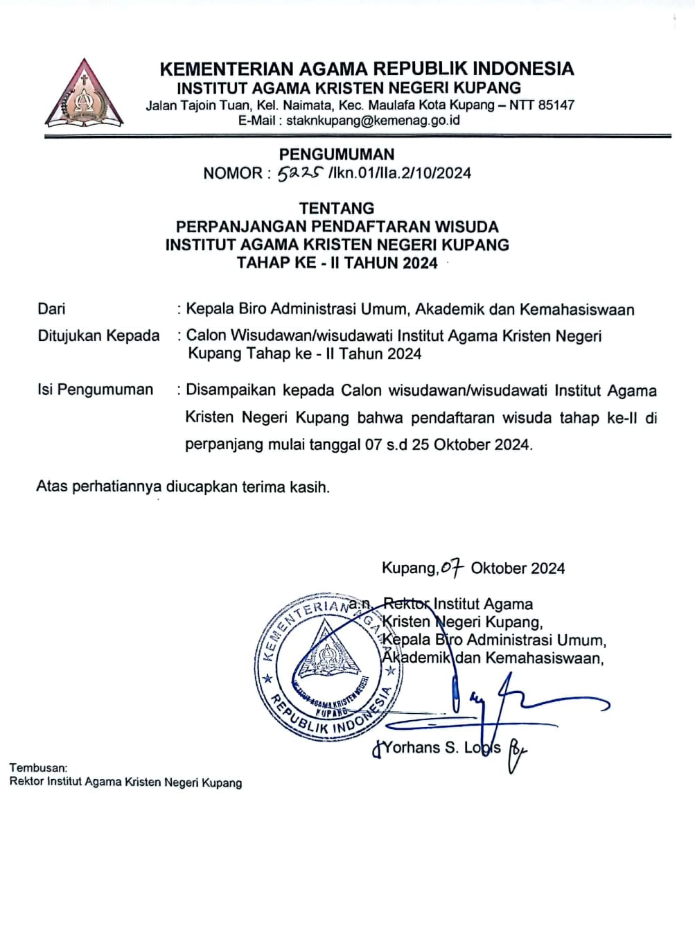 Pengumuman Perpanjangan Wisuda Tahap ke II Tahun 2024 7 Oktober 2024 19:17 WITA | IAKN Kupang | Berita Kampus Silakan Ikuti IAKN Kupang di Social Media Post navigation Sebelumnya: Kemenangan Beruntun Tim Voli IAKN ASelanjutnya: Kemenag Raih Penghargaan Penyelenggara Inovasi Pelayanan Publik Terbaik Tahun 2024 Berita Kampus Lainnya Dekan FISKK IAKN Kupang Ajak Civitas Akademika Jaga Produktivitas dan Sinergi dalam Pelayanan 12/11/2024 IAKN Kupang Gelar Upacara Hari Pahlawan, Ajak Civitas Akademika Teladani Semangat Kepahlawanan 12/11/2024 IAKN Kupang Perkuat Kolaborasi Pendidikan Internasional dengan Taiwan 12/11/2024 IAKN Kupang Apresiasi Mahasiswa Berprestasi, Endi Missa Peraih Emas PEPARNAS XVII 11/11/2024 Pengumuman Perpanjangan Pendaftaran Wisuda Tahap II Tahun 2024 04/11/2024 Rektor IAKN Kupang Tekankan 5 Pilar Mentalitas: Membangun SDM Unggul Bersama Pemkab Kupang 31/10/2024 Audiensi IAKN Kupang dan Pemkab Kupang: Sinergi Membangun SDM Unggul dan Kampus Berintegritas 31/10/2024 IAKN Kupang Jalin Kerja Sama dengan Gwacheon Cultural Center, Korea Selatan 30/10/2024 IAKN Kupang Gelar Seminar Nasional Psikologi: Membangun Resiliensi Mental di Era Society 5.0 30/10/2024 Seminar ‘Fatherless: The Way to Find Yourself’ Dorong Pencarian Jati Diri di Tengah Kehilangan Figur Ayah 30/10/2024 Kategori Acara & Tulisan IlmiahBerita KampusSEKILAS IAKN KUPANG Berita Terbaru IAKN Kupang Gelar Ibadah Awal Pekan: Ajak Civitas Akademika Renungkan Orientasi Kerja dalam Iman 12/11/2024 Acara & Tulisan Ilmiah Baca selengkapnya Dekan FISKK IAKN Kupang Ajak Civitas Akademika Jaga Produktivitas dan Sinergi dalam Pelayanan 12/11/2024 Berita Kampus Baca selengkapnya IAKN Kupang Gelar Upacara Hari Pahlawan, Ajak Civitas Akademika Teladani Semangat Kepahlawanan 12/11/2024 Berita Kampus Baca selengkapnya IAKN Kupang Perkuat Kolaborasi Pendidikan Internasional dengan Taiwan 12/11/2024 Berita Kampus Baca selengkapnya