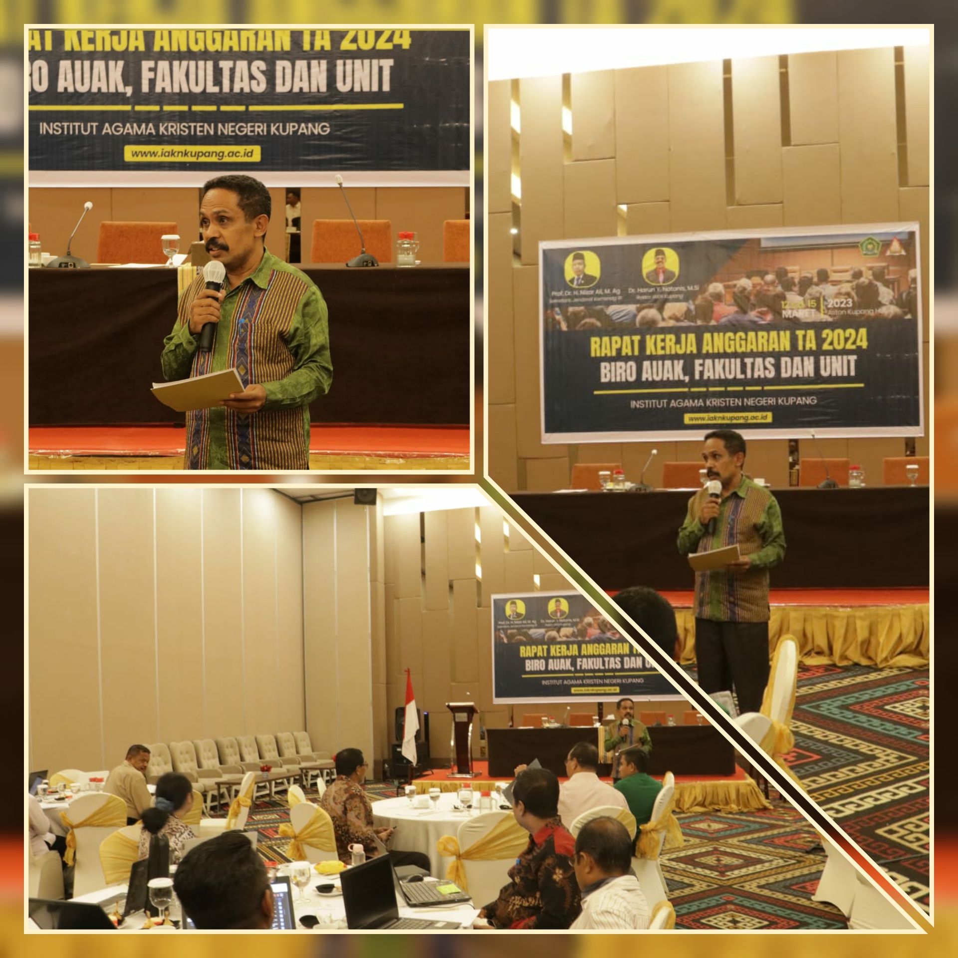 Rektor Institut Agama Kristen Negeri Kupang (Dr. Harun Y. Natonis, M.Si) memberikan arahan Pada hari kedua Kegiatan Rapat Kerja Anggaran T.A 2024 Biro AUAK, Fakultas dan Unit IAKN Kupang (Senin, 13 Maret 2023) di Hotel Aston Kupang, Nusa Tenggara Timur.