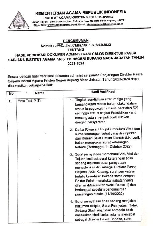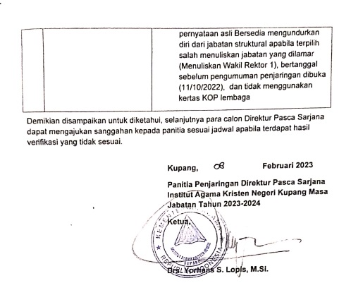 Hasil Verifikasi Dokumen Administrasi Calon Direktur Pasca Sarjana IAKN Kupang Masa Jabatan 2023-2024 20 Maret 2023 14:23 WITA | IAKN Kupang | Berita Kampus Previous Next Silakan Ikuti IAKN Kupang di Social Media Post navigation Sebelumnya: Hasil Verifikasi Dokumen Administrasi Calon Dekan FISKK IAKN Kupang Masa Jabatan 2023-2024Selanjutnya: IAKN Kupang Menjadi Tuan Rumah Ibadah Awal Minggu Ditjen Bimas Kristen Kemenag RI Berita Kampus Lainnya Dekan FISKK IAKN Kupang Ajak Civitas Akademika Jaga Produktivitas dan Sinergi dalam Pelayanan 12/11/2024 IAKN Kupang Gelar Upacara Hari Pahlawan, Ajak Civitas Akademika Teladani Semangat Kepahlawanan 12/11/2024 IAKN Kupang Perkuat Kolaborasi Pendidikan Internasional dengan Taiwan 12/11/2024 IAKN Kupang Apresiasi Mahasiswa Berprestasi, Endi Missa Peraih Emas PEPARNAS XVII 11/11/2024 Pengumuman Perpanjangan Pendaftaran Wisuda Tahap II Tahun 2024 04/11/2024 Rektor IAKN Kupang Tekankan 5 Pilar Mentalitas: Membangun SDM Unggul Bersama Pemkab Kupang 31/10/2024 Audiensi IAKN Kupang dan Pemkab Kupang: Sinergi Membangun SDM Unggul dan Kampus Berintegritas 31/10/2024 IAKN Kupang Jalin Kerja Sama dengan Gwacheon Cultural Center, Korea Selatan 30/10/2024 IAKN Kupang Gelar Seminar Nasional Psikologi: Membangun Resiliensi Mental di Era Society 5.0 30/10/2024 Seminar ‘Fatherless: The Way to Find Yourself’ Dorong Pencarian Jati Diri di Tengah Kehilangan Figur Ayah 30/10/2024 Kategori Acara & Tulisan IlmiahBerita KampusSEKILAS IAKN KUPANG Berita Terbaru IAKN Kupang Gelar Ibadah Awal Pekan: Ajak Civitas Akademika Renungkan Orientasi Kerja dalam Iman 12/11/2024 Acara & Tulisan Ilmiah Baca selengkapnya Dekan FISKK IAKN Kupang Ajak Civitas Akademika Jaga Produktivitas dan Sinergi dalam Pelayanan 12/11/2024 Berita Kampus Baca selengkapnya IAKN Kupang Gelar Upacara Hari Pahlawan, Ajak Civitas Akademika Teladani Semangat Kepahlawanan 12/11/2024 Berita Kampus Baca selengkapnya IAKN Kupang Perkuat Kolaborasi Pendidikan Internasional dengan Taiwan 12/11/2024 Berita Kampus Baca selengkapnya