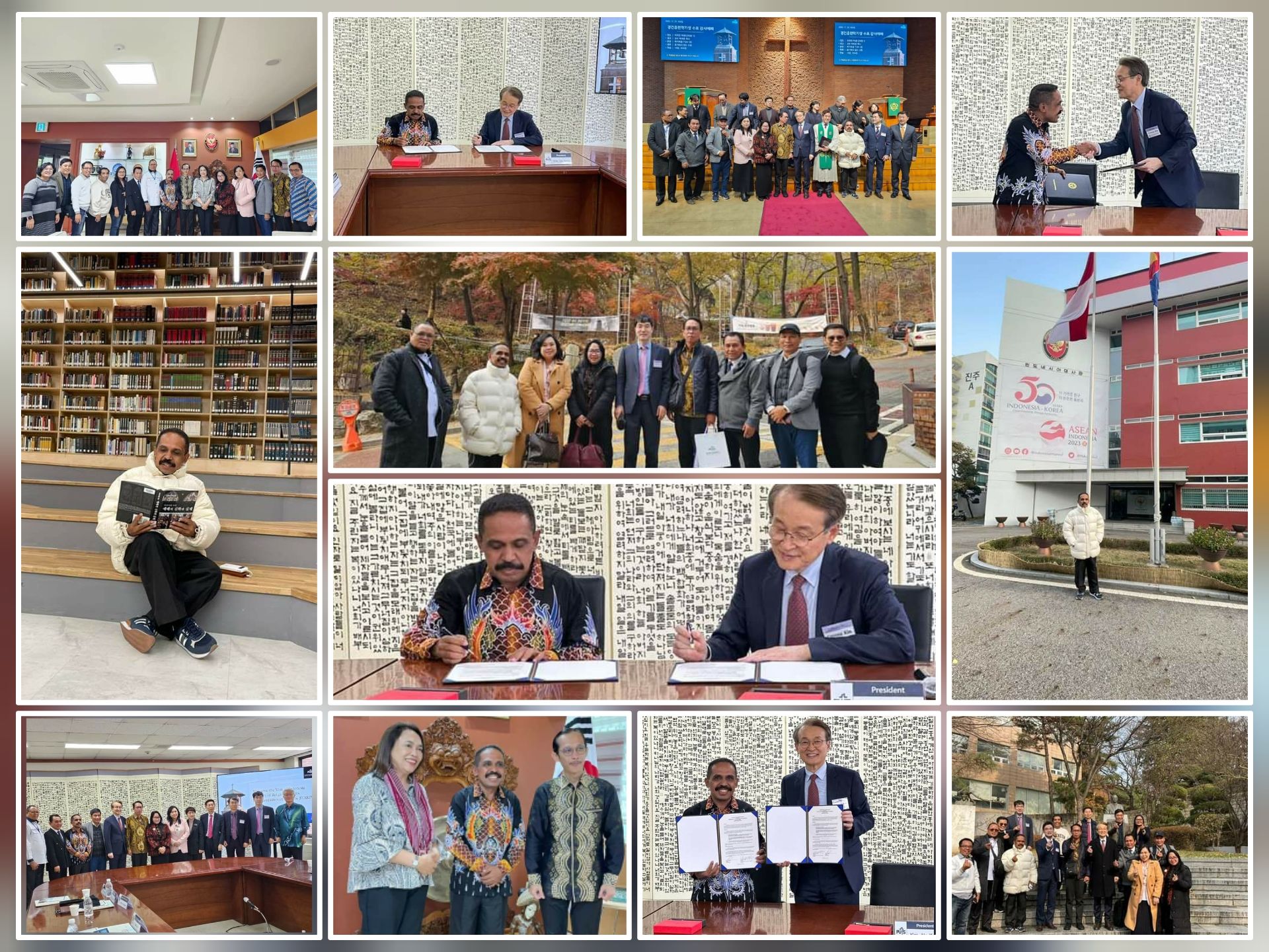IAKN Kupang (Kemenag) – – – Pada Kamis, (23/11/2023), Institut Agama Kristen Negeri Kupang (IAKN Kupang) melakukan penandatanganan Memorandum of Understanding (MoU) dengan Presbyterian University and Theological Seminary (PUTS) di Korea Selatan. Acara ini merupakan bagian dari rangkaian kegiatan kunjungan Para Rektor PTKKN yakni Rektor IAKN Kupang (Dr.Harun Y. Natonis, M.Si), Rektor IAKN Palangka Raya ( Telhalia, MTh., D.Th), Rektor IAKN Manado (Dr. Olivia Cherly Wuwung, S.T., M.Pd), Rektor IAKN Tarutung (Prof. Dr. Albiner Siagian, M. Si), Rektor IAKN Toraja (Dr. Joni Tapingku, M.Th), dan Ketua STAKN Sentani (Dr. Fredrik Warwer, M.Th), yang didampingi oleh Kepala Subdirektorat Pendidikan Tinggi pada Direktorat Pendidikan Kristen Direktorat Jenderal Bimbingan Masyarakat Kristen Kementerian Agama (Salmon Pamantung, Ph.D) ke Korea Selatan, yang dilakukan untuk memperluas kerjasama di bidang pendidikan dan penelitian.