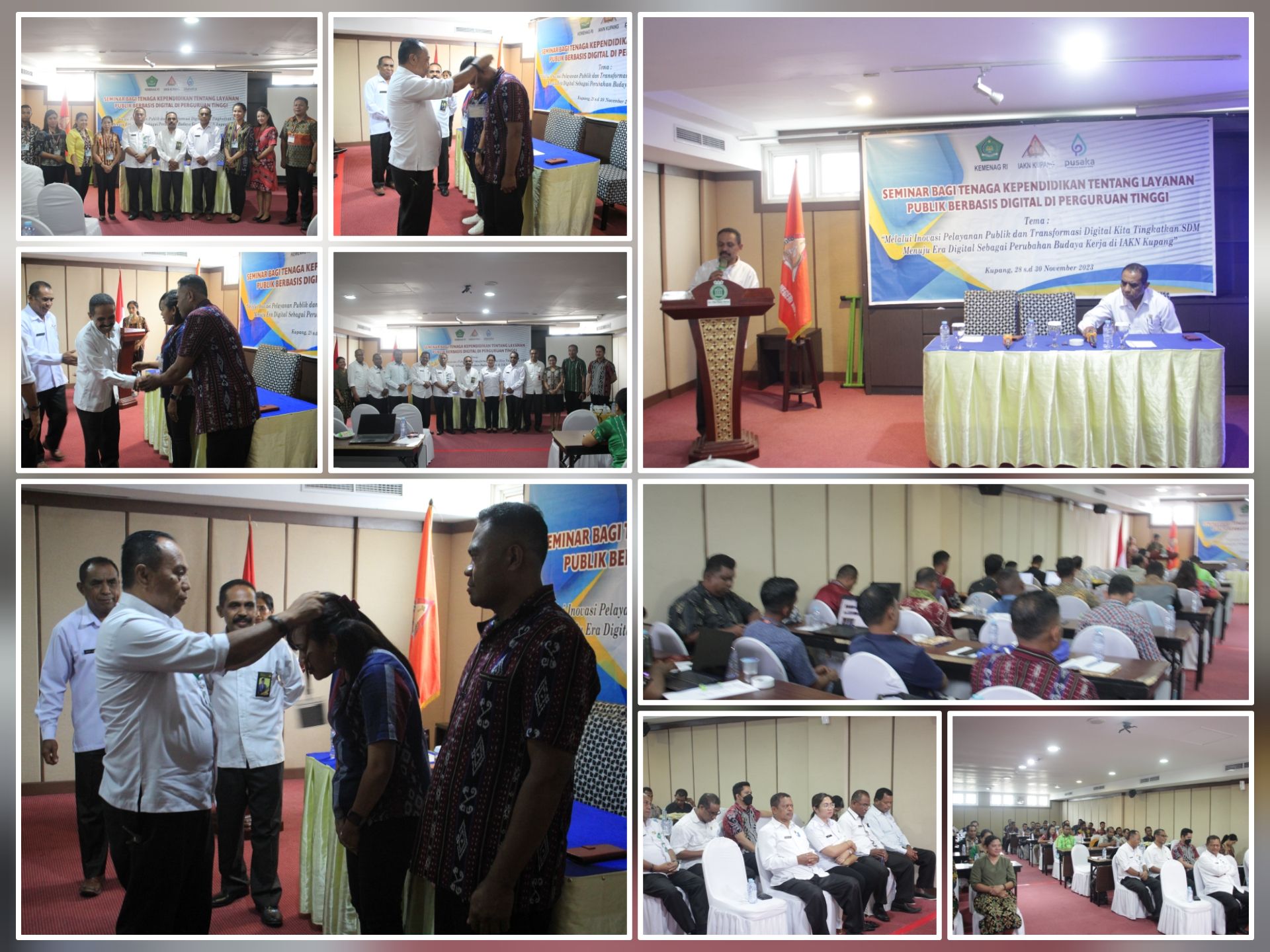 IAKN Kupang (Kemenag) – – – Institut Agama Kristen Negeri (IAKN) Kupang mengambil inisiatif untuk menghadirkan perspektif baru dalam mengantisipasi perubahan pelayanan publik dengan menggelar seminar bagi tenaga kependidikan. Dengan tema “Melalui Inovasi Pelayanan Publik dan Transformasi Digital Kita Tingkatkan SDM Menuju Era Digital Sebagai Perubahan Budaya Kerja di IAKN Kupang,” kegiatan ini bertujuan memberikan wawasan dan pemahaman tentang pentingnya transformasi digital dalam lingkungan perguruan tinggi.