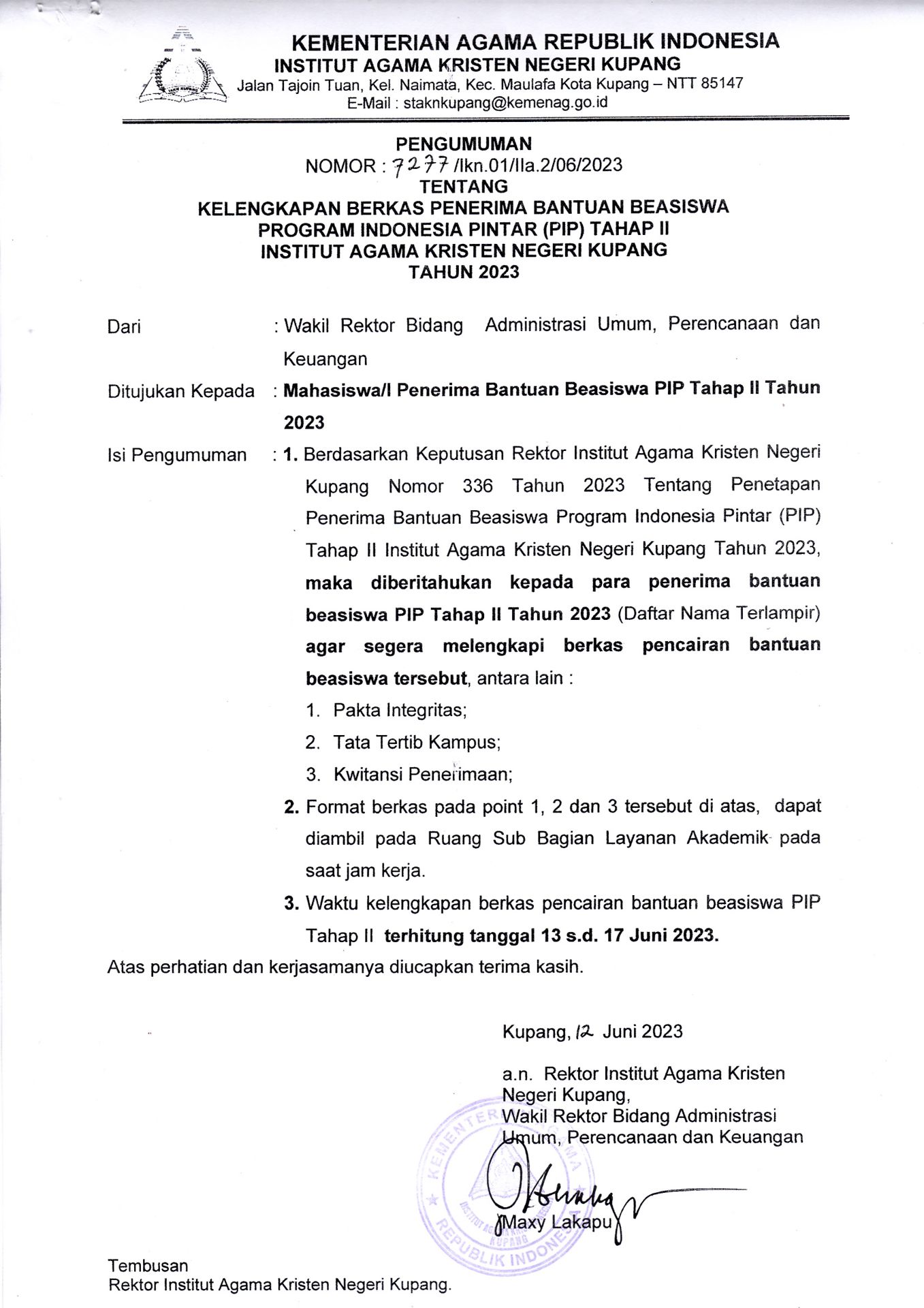 Lampiran Pengumuman Kelengkapan Berkas Penerima Bantuan Beasiswa PIP Tahap II Tahun 2023