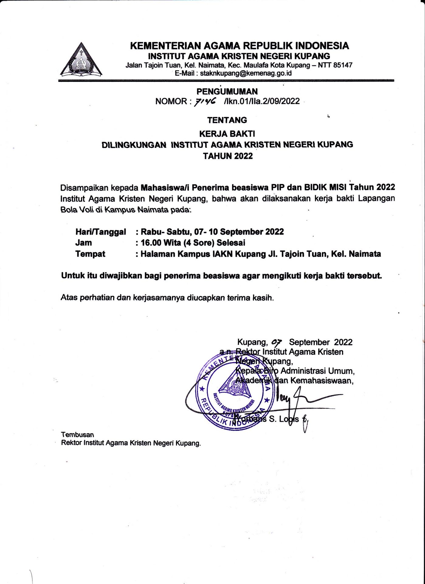 Kerja Bakti 7 September 2022 04:24 WITA | IAKN Kupang | Acara & Tulisan Ilmiah Previous Next Silakan Ikuti IAKN Kupang di Social Media Post navigation Sebelumnya: Perpanjangan Pendaftaran Wisuda Tahun 2022Selanjutnya: Pembukaan Pendaftaran Beasiswa PIP Mahasiswa Baru Tahun Akademik 2022/2023 Acara & Tulisan Ilmiah Lainnya IAKN Kupang Gelar Ibadah Awal Pekan: Ajak Civitas Akademika Renungkan Orientasi Kerja dalam Iman 12/11/2024 Mendorong Inovasi Pendidikan: Arahan Dekan FKIPK di Apel Pagi Jadi Sorotan 24/10/2024 Apel Kesadaran di Lingkup IAKN Kupang, Rektor Tekankan Disiplin dan Komitmen dalam Melaksanakan Tanggung Jawab 19/10/2024 MEMOTRET HARI INI, MEMBIDIK MASA DEPAN: Membaca Perubahan Mentalitas. Oleh: I Made Suardana 08/10/2024 Apel Pagi IAKN Kupang: Semangat Baru Menuju Masa Depan Gemilang 02/10/2024 Rektor IAKN Kupang : “Masa Depan dan Harapan Harus Dikerjakan Hari Ini untuk Esok yang Lebih Baik” 09/09/2024 Plt. WR I, Marla M. Djami, M.Si Tekankan Pentingnya Persiapan Akademik dalam Arahan Apel Pagi IAKN Kupang 09/09/2024 Call For Paper Tingkat Nasional 04/09/2024 Plt. Dekan FISKK IAKN Kupang Tegaskan Persiapan Kegiatan Akademik dan Kegiatan Kampus di Apel Pagi 03/09/2024 Apel Pagi Pada Senin, 19 Agustus 2024: Kepala Biro AUAK Dorong Keaktifan dalam Kepanitiaan 19/08/2024 Kategori Acara & Tulisan IlmiahBerita KampusSEKILAS IAKN KUPANG Berita Terbaru IAKN Kupang Gelar Ibadah Awal Pekan: Ajak Civitas Akademika Renungkan Orientasi Kerja dalam Iman 12/11/2024 Acara & Tulisan Ilmiah Baca selengkapnya Dekan FISKK IAKN Kupang Ajak Civitas Akademika Jaga Produktivitas dan Sinergi dalam Pelayanan 12/11/2024 Berita Kampus Baca selengkapnya IAKN Kupang Gelar Upacara Hari Pahlawan, Ajak Civitas Akademika Teladani Semangat Kepahlawanan 12/11/2024 Berita Kampus Baca selengkapnya IAKN Kupang Perkuat Kolaborasi Pendidikan Internasional dengan Taiwan 12/11/2024 Berita Kampus Baca selengkapnya