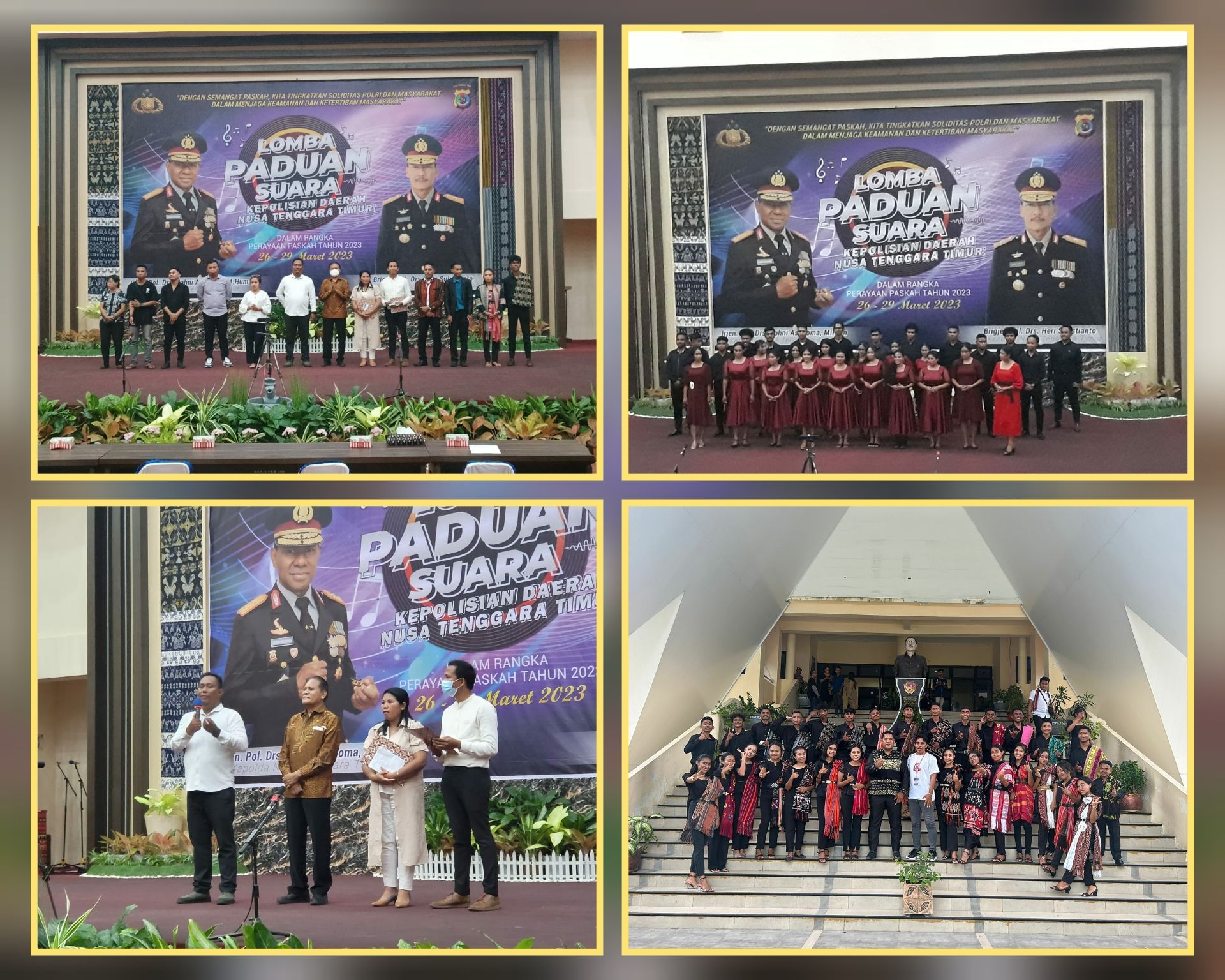 Kepolisian Daerah Nusa Tenggara Timur (NTT) menggelar lomba paduan suara Gerejawi dalam rangka menyambut Hari Raya Paskah di Aula El Tari, Kota Kupang, Pada Tanggal 26 – 29 Maret 2023 dengan Tema “Dengan Semangat Paskah, Kita Tingkatkan Soliditas Polri dan Masyarakat Dalam Menjaga Keamanan dan Ketertiban Masyarakat.” Lomba Paduan Suara tersebut diikuti oleh 24 Tim Paduan Suara yang berasal dari gereja, instansi pemerintahan, serta perguruan tinggi di NTT.
