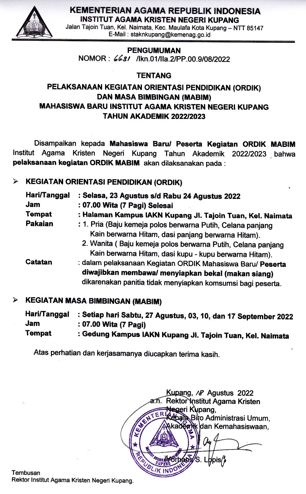 Pelaksanaan Kegiatan Ordik Mabim Mahasiswa Baru Tahun 2022 18 Agustus 2022 07:48 WITA | IAKN Kupang | Berita Kampus Previous Next Silakan Ikuti IAKN Kupang di Social Media Post navigation Sebelumnya: Pertemuan Panitia Ordik Mabim Bersama Mahasiswa Baru Tahun 2022Selanjutnya: Kelengkapan Berkas Beasiswa PIP Jalur SELNAS Mahasiswa Baru T.A 2022/2023 Berita Kampus Lainnya Dekan FISKK IAKN Kupang Ajak Civitas Akademika Jaga Produktivitas dan Sinergi dalam Pelayanan 12/11/2024 IAKN Kupang Gelar Upacara Hari Pahlawan, Ajak Civitas Akademika Teladani Semangat Kepahlawanan 12/11/2024 IAKN Kupang Perkuat Kolaborasi Pendidikan Internasional dengan Taiwan 12/11/2024 IAKN Kupang Apresiasi Mahasiswa Berprestasi, Endi Missa Peraih Emas PEPARNAS XVII 11/11/2024 Pengumuman Perpanjangan Pendaftaran Wisuda Tahap II Tahun 2024 04/11/2024 Rektor IAKN Kupang Tekankan 5 Pilar Mentalitas: Membangun SDM Unggul Bersama Pemkab Kupang 31/10/2024 Audiensi IAKN Kupang dan Pemkab Kupang: Sinergi Membangun SDM Unggul dan Kampus Berintegritas 31/10/2024 IAKN Kupang Jalin Kerja Sama dengan Gwacheon Cultural Center, Korea Selatan 30/10/2024 IAKN Kupang Gelar Seminar Nasional Psikologi: Membangun Resiliensi Mental di Era Society 5.0 30/10/2024 Seminar ‘Fatherless: The Way to Find Yourself’ Dorong Pencarian Jati Diri di Tengah Kehilangan Figur Ayah 30/10/2024 Kategori Acara & Tulisan IlmiahBerita KampusSEKILAS IAKN KUPANG Berita Terbaru IAKN Kupang Gelar Ibadah Awal Pekan: Ajak Civitas Akademika Renungkan Orientasi Kerja dalam Iman 12/11/2024 Acara & Tulisan Ilmiah Baca selengkapnya Dekan FISKK IAKN Kupang Ajak Civitas Akademika Jaga Produktivitas dan Sinergi dalam Pelayanan 12/11/2024 Berita Kampus Baca selengkapnya IAKN Kupang Gelar Upacara Hari Pahlawan, Ajak Civitas Akademika Teladani Semangat Kepahlawanan 12/11/2024 Berita Kampus Baca selengkapnya IAKN Kupang Perkuat Kolaborasi Pendidikan Internasional dengan Taiwan 12/11/2024 Berita Kampus Baca selengkapnya