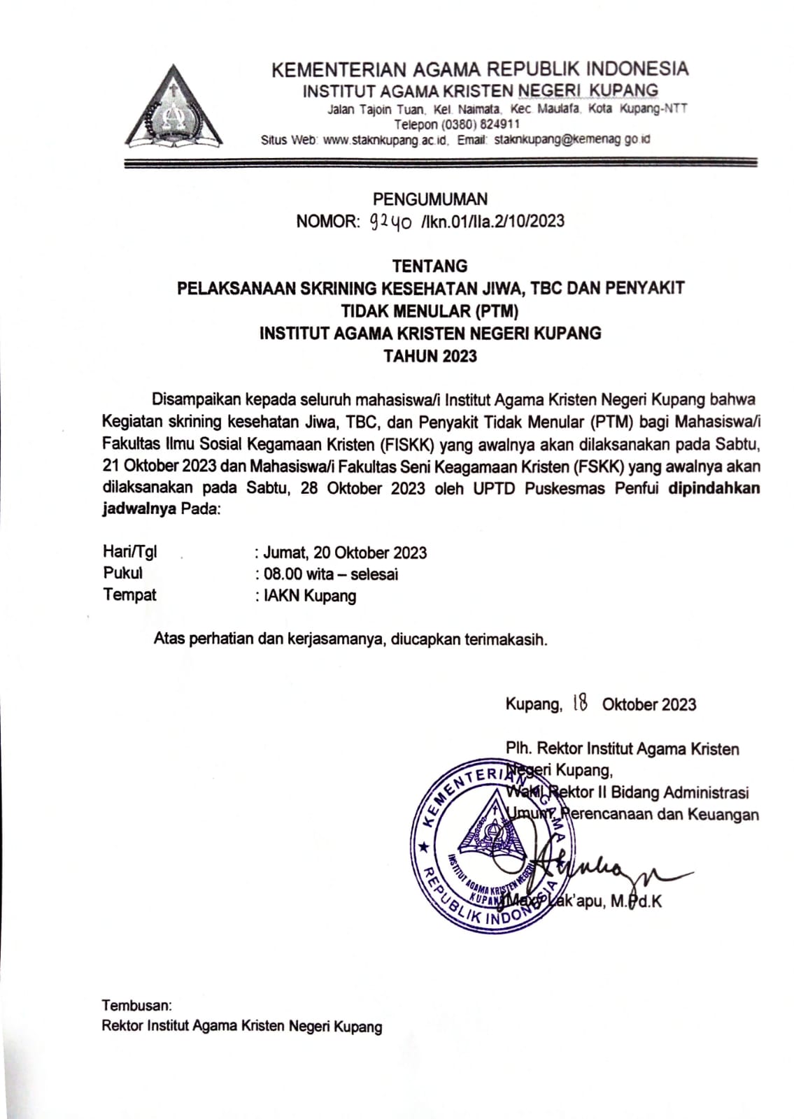 Pelaksanaan Skrining Kesehatan Jiwa, TBC dan Penyakit Tidak Menular (PTM) Tahun 2023 18 Oktober 2023 10:05 WITA | IAKN Kupang | Berita Kampus Previous Next Silakan Ikuti IAKN Kupang di Social Media Post navigation Sebelumnya: Institut Agama Kristen Negeri (IAKN) Kupang Ikuti Ibadah Awal Pekan Direktorat Jenderal Bimas Kristen Kemenag RI pada Senin, 16 Oktober 2023Selanjutnya: Mahasiswa/i IAKN Kupang Membawa Semangat Juara dalam TLM CUP II 2023 Volleyball Tournament Berita Kampus Lainnya Dekan FISKK IAKN Kupang Ajak Civitas Akademika Jaga Produktivitas dan Sinergi dalam Pelayanan 12/11/2024 IAKN Kupang Gelar Upacara Hari Pahlawan, Ajak Civitas Akademika Teladani Semangat Kepahlawanan 12/11/2024 IAKN Kupang Perkuat Kolaborasi Pendidikan Internasional dengan Taiwan 12/11/2024 IAKN Kupang Apresiasi Mahasiswa Berprestasi, Endi Missa Peraih Emas PEPARNAS XVII 11/11/2024 Pengumuman Perpanjangan Pendaftaran Wisuda Tahap II Tahun 2024 04/11/2024 Rektor IAKN Kupang Tekankan 5 Pilar Mentalitas: Membangun SDM Unggul Bersama Pemkab Kupang 31/10/2024 Audiensi IAKN Kupang dan Pemkab Kupang: Sinergi Membangun SDM Unggul dan Kampus Berintegritas 31/10/2024 IAKN Kupang Jalin Kerja Sama dengan Gwacheon Cultural Center, Korea Selatan 30/10/2024 IAKN Kupang Gelar Seminar Nasional Psikologi: Membangun Resiliensi Mental di Era Society 5.0 30/10/2024 Seminar ‘Fatherless: The Way to Find Yourself’ Dorong Pencarian Jati Diri di Tengah Kehilangan Figur Ayah 30/10/2024 Kategori Acara & Tulisan IlmiahBerita KampusSEKILAS IAKN KUPANG Berita Terbaru IAKN Kupang Gelar Ibadah Awal Pekan: Ajak Civitas Akademika Renungkan Orientasi Kerja dalam Iman 12/11/2024 Acara & Tulisan Ilmiah Baca selengkapnya Dekan FISKK IAKN Kupang Ajak Civitas Akademika Jaga Produktivitas dan Sinergi dalam Pelayanan 12/11/2024 Berita Kampus Baca selengkapnya IAKN Kupang Gelar Upacara Hari Pahlawan, Ajak Civitas Akademika Teladani Semangat Kepahlawanan 12/11/2024 Berita Kampus Baca selengkapnya IAKN Kupang Perkuat Kolaborasi Pendidikan Internasional dengan Taiwan 12/11/2024 Berita Kampus Baca selengkapnya