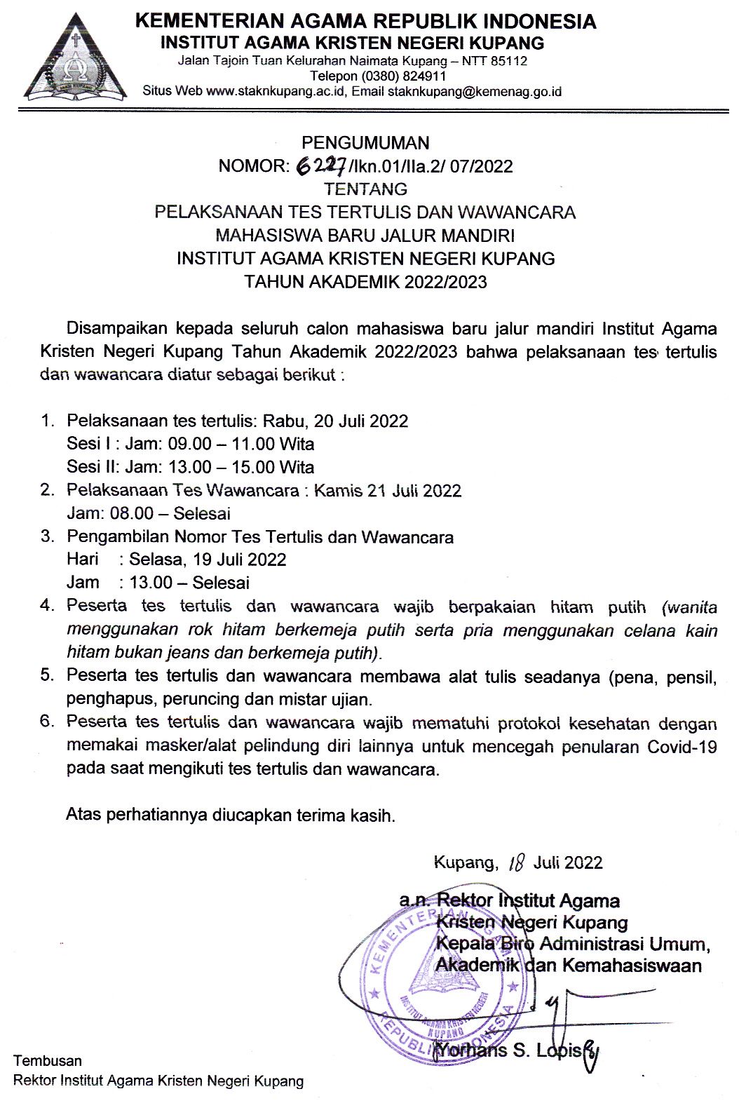 Pelaksanaan Tes Tertulis dan Wawancara Mahasiswa Baru Jalur Mandiri T.A 2022/2023 18 Juli 2022 08:02 WITA | IAKN Kupang | Berita Kampus Previous Next Silakan Ikuti IAKN Kupang di Social Media Post navigation Sebelumnya: Penutupan Pendaftaran Mahasiswa Baru Jalur Mandiri Tahun 2022Selanjutnya: Registrasi Semester Gasal Tahun Akademik 2022/2023 Berita Kampus Lainnya Dekan FISKK IAKN Kupang Ajak Civitas Akademika Jaga Produktivitas dan Sinergi dalam Pelayanan 12/11/2024 IAKN Kupang Gelar Upacara Hari Pahlawan, Ajak Civitas Akademika Teladani Semangat Kepahlawanan 12/11/2024 IAKN Kupang Perkuat Kolaborasi Pendidikan Internasional dengan Taiwan 12/11/2024 IAKN Kupang Apresiasi Mahasiswa Berprestasi, Endi Missa Peraih Emas PEPARNAS XVII 11/11/2024 Pengumuman Perpanjangan Pendaftaran Wisuda Tahap II Tahun 2024 04/11/2024 Rektor IAKN Kupang Tekankan 5 Pilar Mentalitas: Membangun SDM Unggul Bersama Pemkab Kupang 31/10/2024 Audiensi IAKN Kupang dan Pemkab Kupang: Sinergi Membangun SDM Unggul dan Kampus Berintegritas 31/10/2024 IAKN Kupang Jalin Kerja Sama dengan Gwacheon Cultural Center, Korea Selatan 30/10/2024 IAKN Kupang Gelar Seminar Nasional Psikologi: Membangun Resiliensi Mental di Era Society 5.0 30/10/2024 Seminar ‘Fatherless: The Way to Find Yourself’ Dorong Pencarian Jati Diri di Tengah Kehilangan Figur Ayah 30/10/2024 Kategori Acara & Tulisan IlmiahBerita KampusSEKILAS IAKN KUPANG Berita Terbaru IAKN Kupang Gelar Ibadah Awal Pekan: Ajak Civitas Akademika Renungkan Orientasi Kerja dalam Iman 12/11/2024 Acara & Tulisan Ilmiah Baca selengkapnya Dekan FISKK IAKN Kupang Ajak Civitas Akademika Jaga Produktivitas dan Sinergi dalam Pelayanan 12/11/2024 Berita Kampus Baca selengkapnya IAKN Kupang Gelar Upacara Hari Pahlawan, Ajak Civitas Akademika Teladani Semangat Kepahlawanan 12/11/2024 Berita Kampus Baca selengkapnya IAKN Kupang Perkuat Kolaborasi Pendidikan Internasional dengan Taiwan 12/11/2024 Berita Kampus Baca selengkapnya
