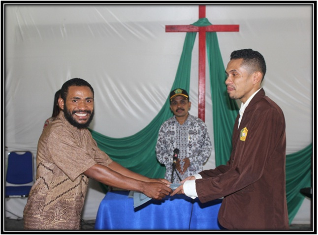 Serah terima Ketua BEM 2017 Yedice Kamangmau (Kanan Gambar) kepada Ketua BEM terpilih 2017 Lyper Demarchas Imanuel Tse (Kiri Gambar) disaksikan oleh Ketua STAKN Kupang Dr. Harun Y. Natonis, M.Si (tengah).