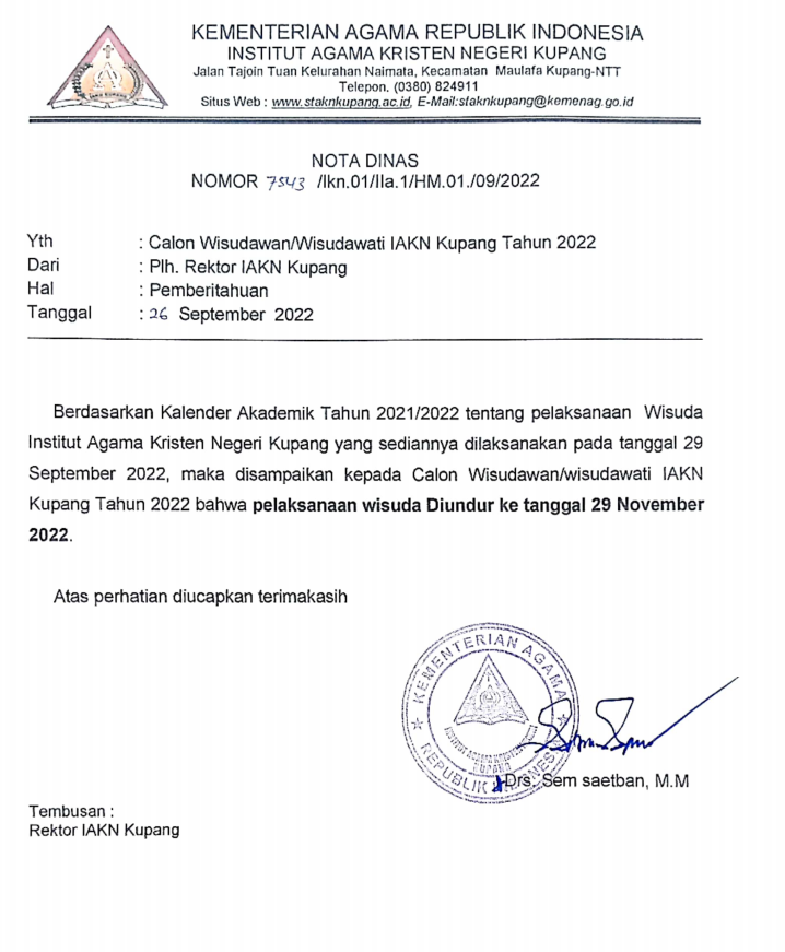Pemberitahuan Pelaksanaan Wisuda 2022 26 September 2022 08:52 WITA | IAKN Kupang | Berita Kampus Previous Next Silakan Ikuti IAKN Kupang di Social Media Post navigation Sebelumnya: Pemberitahuan Pemeriksaan Data (Validasi Data)Selanjutnya: Perpanjangan Pendaftaran Wisuda Tahun 2022 Berita Kampus Lainnya Dekan FISKK IAKN Kupang Ajak Civitas Akademika Jaga Produktivitas dan Sinergi dalam Pelayanan 12/11/2024 IAKN Kupang Gelar Upacara Hari Pahlawan, Ajak Civitas Akademika Teladani Semangat Kepahlawanan 12/11/2024 IAKN Kupang Perkuat Kolaborasi Pendidikan Internasional dengan Taiwan 12/11/2024 IAKN Kupang Apresiasi Mahasiswa Berprestasi, Endi Missa Peraih Emas PEPARNAS XVII 11/11/2024 Pengumuman Perpanjangan Pendaftaran Wisuda Tahap II Tahun 2024 04/11/2024 Rektor IAKN Kupang Tekankan 5 Pilar Mentalitas: Membangun SDM Unggul Bersama Pemkab Kupang 31/10/2024 Audiensi IAKN Kupang dan Pemkab Kupang: Sinergi Membangun SDM Unggul dan Kampus Berintegritas 31/10/2024 IAKN Kupang Jalin Kerja Sama dengan Gwacheon Cultural Center, Korea Selatan 30/10/2024 IAKN Kupang Gelar Seminar Nasional Psikologi: Membangun Resiliensi Mental di Era Society 5.0 30/10/2024 Seminar ‘Fatherless: The Way to Find Yourself’ Dorong Pencarian Jati Diri di Tengah Kehilangan Figur Ayah 30/10/2024 Kategori Acara & Tulisan IlmiahBerita KampusSEKILAS IAKN KUPANG Berita Terbaru IAKN Kupang Gelar Ibadah Awal Pekan: Ajak Civitas Akademika Renungkan Orientasi Kerja dalam Iman 12/11/2024 Acara & Tulisan Ilmiah Baca selengkapnya Dekan FISKK IAKN Kupang Ajak Civitas Akademika Jaga Produktivitas dan Sinergi dalam Pelayanan 12/11/2024 Berita Kampus Baca selengkapnya IAKN Kupang Gelar Upacara Hari Pahlawan, Ajak Civitas Akademika Teladani Semangat Kepahlawanan 12/11/2024 Berita Kampus Baca selengkapnya IAKN Kupang Perkuat Kolaborasi Pendidikan Internasional dengan Taiwan 12/11/2024 Berita Kampus Baca selengkapnya