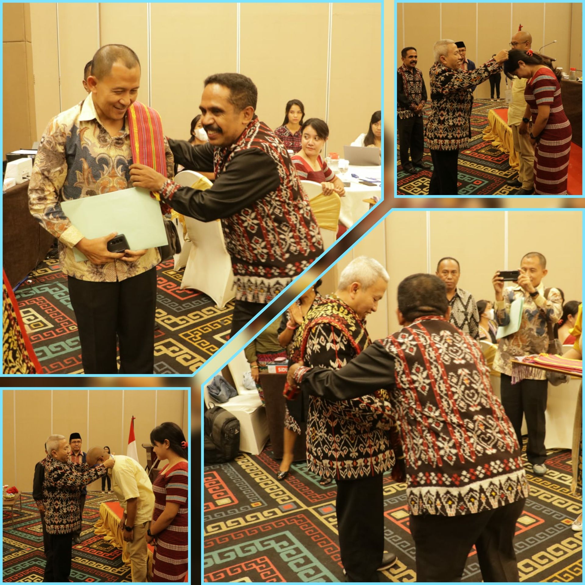 Kegiatan Pembukaan dialnjutkan dengan penyematan tanda peserta oleh Sekjen Kemenag RI, Doa oleh Wakil Rektor I IAKN Kupang (Marla M. Djami, M.Si), Foto Bersama Sekjen Kemenag RI dan Makan Siang.