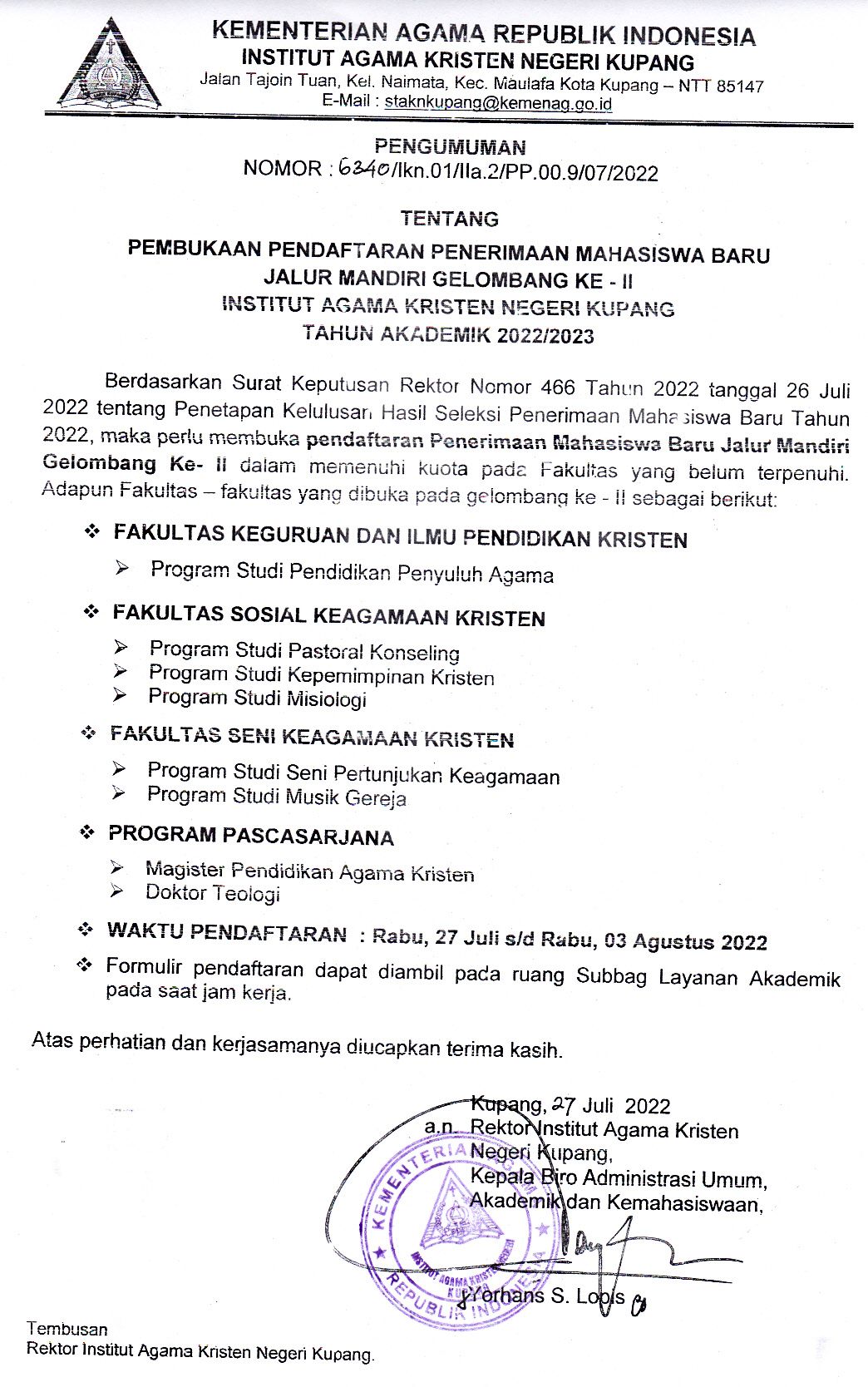 Pembukaan Pendaftaran Penerimaan Mahasiswa Baru Jalur Mandiri Gelombang Ke-II Tahun 2022 27 Juli 2022 08:22 WITA | IAKN Kupang | Berita Kampus Previous Next Silakan Ikuti IAKN Kupang di Social Media Post navigation Sebelumnya: Penetapan Kelulusan Hasil Seleksi PMB Jalur Mandiri Tahun 2022Selanjutnya: Penetapan Kelompok Uang Kuliah Tunggal Mahasiswa Baru T.A 2022/2023 Berita Kampus Lainnya Dekan FISKK IAKN Kupang Ajak Civitas Akademika Jaga Produktivitas dan Sinergi dalam Pelayanan 12/11/2024 IAKN Kupang Gelar Upacara Hari Pahlawan, Ajak Civitas Akademika Teladani Semangat Kepahlawanan 12/11/2024 IAKN Kupang Perkuat Kolaborasi Pendidikan Internasional dengan Taiwan 12/11/2024 IAKN Kupang Apresiasi Mahasiswa Berprestasi, Endi Missa Peraih Emas PEPARNAS XVII 11/11/2024 Pengumuman Perpanjangan Pendaftaran Wisuda Tahap II Tahun 2024 04/11/2024 Rektor IAKN Kupang Tekankan 5 Pilar Mentalitas: Membangun SDM Unggul Bersama Pemkab Kupang 31/10/2024 Audiensi IAKN Kupang dan Pemkab Kupang: Sinergi Membangun SDM Unggul dan Kampus Berintegritas 31/10/2024 IAKN Kupang Jalin Kerja Sama dengan Gwacheon Cultural Center, Korea Selatan 30/10/2024 IAKN Kupang Gelar Seminar Nasional Psikologi: Membangun Resiliensi Mental di Era Society 5.0 30/10/2024 Seminar ‘Fatherless: The Way to Find Yourself’ Dorong Pencarian Jati Diri di Tengah Kehilangan Figur Ayah 30/10/2024 Kategori Acara & Tulisan IlmiahBerita KampusSEKILAS IAKN KUPANG Berita Terbaru IAKN Kupang Gelar Ibadah Awal Pekan: Ajak Civitas Akademika Renungkan Orientasi Kerja dalam Iman 12/11/2024 Acara & Tulisan Ilmiah Baca selengkapnya Dekan FISKK IAKN Kupang Ajak Civitas Akademika Jaga Produktivitas dan Sinergi dalam Pelayanan 12/11/2024 Berita Kampus Baca selengkapnya IAKN Kupang Gelar Upacara Hari Pahlawan, Ajak Civitas Akademika Teladani Semangat Kepahlawanan 12/11/2024 Berita Kampus Baca selengkapnya IAKN Kupang Perkuat Kolaborasi Pendidikan Internasional dengan Taiwan 12/11/2024 Berita Kampus Baca selengkapnya