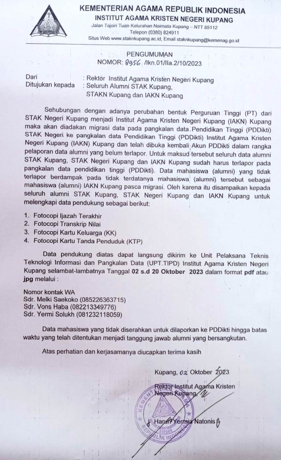 - Pengumuman ini hanya berlaku bagi alumni yang belum terlapor pada PDDikti atau Kesalahan dalam penginputan Data (Nama, Kelamin dan Tempat Tanggal Lahir).