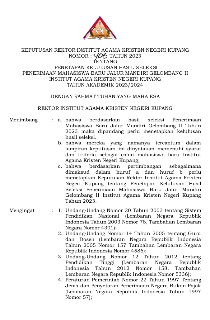 Penetapan Kelulusan Hasil Seleksi Penerimaan Mahasiswa Baru Jalur Mandiri Gelombang II Tahun Akademik 2023/2024 10 Agustus 2023 19:42 WITA | IAKN Kupang | Berita Kampus Previous Next LAMPIRAN PENGUMUMAN PENETAPAN KELULUSAN GEL. II Silakan Ikuti IAKN Kupang di Social Media Post navigation Sebelumnya: Berikanlah ide kreatif untuk membangun lembaga ini” Ucap Dekan FSKK Saat Menyampaikan Arahan Pada Apel Pagi 31 Juli 2023Selanjutnya: Penetapan Kelompok Uang Kuliah Tunggal Mahasiswa Baru Gelombang II T.A 2023/2024 Berita Kampus Lainnya Dekan FISKK IAKN Kupang Ajak Civitas Akademika Jaga Produktivitas dan Sinergi dalam Pelayanan 12/11/2024 IAKN Kupang Gelar Upacara Hari Pahlawan, Ajak Civitas Akademika Teladani Semangat Kepahlawanan 12/11/2024 IAKN Kupang Perkuat Kolaborasi Pendidikan Internasional dengan Taiwan 12/11/2024 IAKN Kupang Apresiasi Mahasiswa Berprestasi, Endi Missa Peraih Emas PEPARNAS XVII 11/11/2024 Pengumuman Perpanjangan Pendaftaran Wisuda Tahap II Tahun 2024 04/11/2024 Rektor IAKN Kupang Tekankan 5 Pilar Mentalitas: Membangun SDM Unggul Bersama Pemkab Kupang 31/10/2024 Audiensi IAKN Kupang dan Pemkab Kupang: Sinergi Membangun SDM Unggul dan Kampus Berintegritas 31/10/2024 IAKN Kupang Jalin Kerja Sama dengan Gwacheon Cultural Center, Korea Selatan 30/10/2024 IAKN Kupang Gelar Seminar Nasional Psikologi: Membangun Resiliensi Mental di Era Society 5.0 30/10/2024 Seminar ‘Fatherless: The Way to Find Yourself’ Dorong Pencarian Jati Diri di Tengah Kehilangan Figur Ayah 30/10/2024 Kategori Acara & Tulisan IlmiahBerita KampusSEKILAS IAKN KUPANG Berita Terbaru IAKN Kupang Gelar Ibadah Awal Pekan: Ajak Civitas Akademika Renungkan Orientasi Kerja dalam Iman 12/11/2024 Acara & Tulisan Ilmiah Baca selengkapnya Dekan FISKK IAKN Kupang Ajak Civitas Akademika Jaga Produktivitas dan Sinergi dalam Pelayanan 12/11/2024 Berita Kampus Baca selengkapnya IAKN Kupang Gelar Upacara Hari Pahlawan, Ajak Civitas Akademika Teladani Semangat Kepahlawanan 12/11/2024 Berita Kampus Baca selengkapnya IAKN Kupang Perkuat Kolaborasi Pendidikan Internasional dengan Taiwan 12/11/2024 Berita Kampus Baca selengkapnya