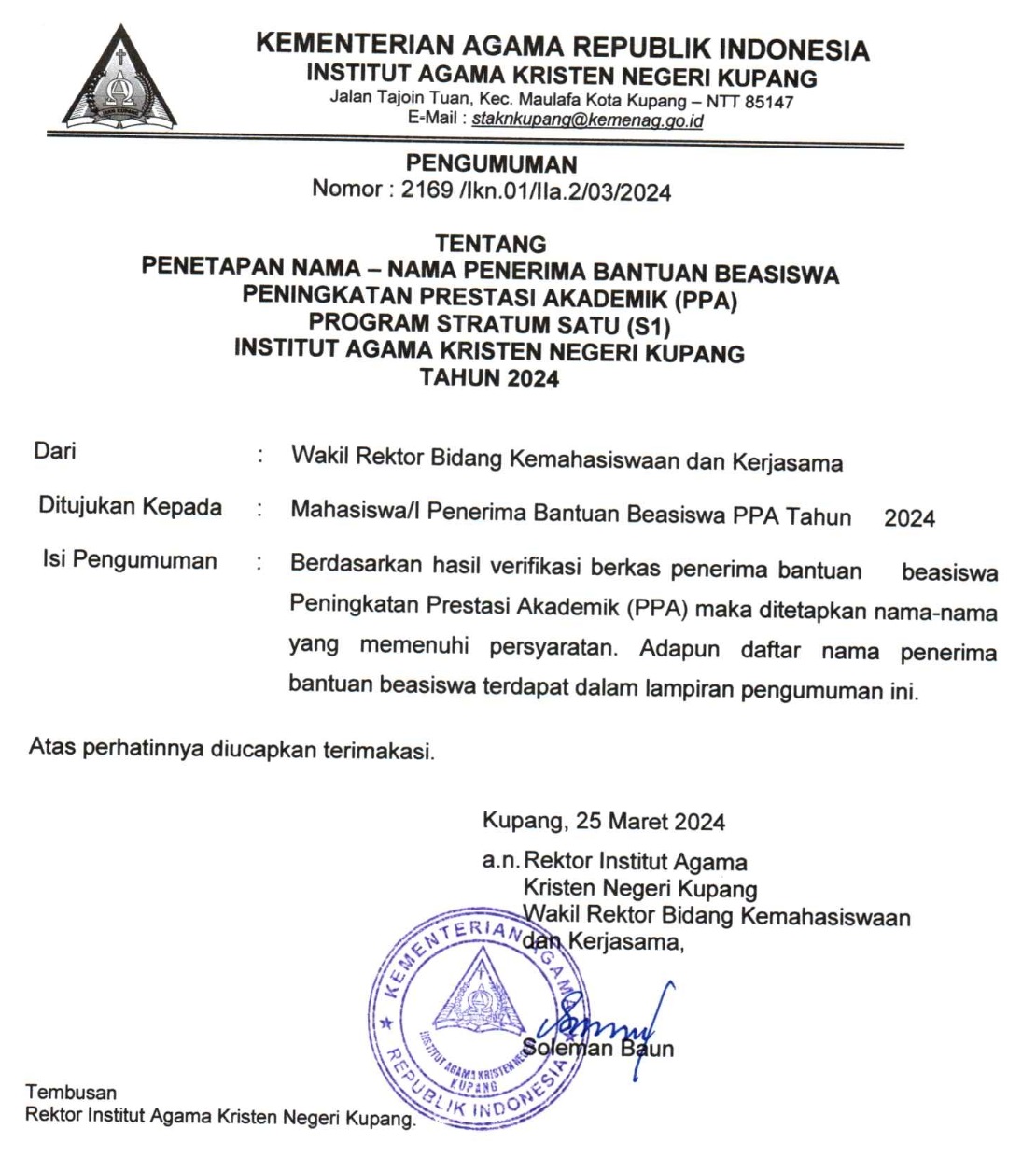 Penetapan Nama-Nama Penerima Bantuan Beasiswa PPA Program S1 Tahun 2024 16 April 2024 18:11 WITA | IAKN Kupang | Berita Kampus Previous Next Lampiran Nama Penerima Bantuan Beasiswa PPA S1 2024 Silakan Ikuti IAKN Kupang di Social Media Post navigation Sebelumnya: Memulai Hari dengan Semangat: Apel Pagi di IAKN Kupang Sambut Kembali Aktivitas Pasca Libur LebaranSelanjutnya: Rektor IAKN Kupang Dorong Peningkatan Publikasi Ilmiah Melalui Workshop Pengelolaan Jurnal Berita Kampus Lainnya Dekan FISKK IAKN Kupang Ajak Civitas Akademika Jaga Produktivitas dan Sinergi dalam Pelayanan 12/11/2024 IAKN Kupang Gelar Upacara Hari Pahlawan, Ajak Civitas Akademika Teladani Semangat Kepahlawanan 12/11/2024 IAKN Kupang Perkuat Kolaborasi Pendidikan Internasional dengan Taiwan 12/11/2024 IAKN Kupang Apresiasi Mahasiswa Berprestasi, Endi Missa Peraih Emas PEPARNAS XVII 11/11/2024 Pengumuman Perpanjangan Pendaftaran Wisuda Tahap II Tahun 2024 04/11/2024 Rektor IAKN Kupang Tekankan 5 Pilar Mentalitas: Membangun SDM Unggul Bersama Pemkab Kupang 31/10/2024 Audiensi IAKN Kupang dan Pemkab Kupang: Sinergi Membangun SDM Unggul dan Kampus Berintegritas 31/10/2024 IAKN Kupang Jalin Kerja Sama dengan Gwacheon Cultural Center, Korea Selatan 30/10/2024 IAKN Kupang Gelar Seminar Nasional Psikologi: Membangun Resiliensi Mental di Era Society 5.0 30/10/2024 Seminar ‘Fatherless: The Way to Find Yourself’ Dorong Pencarian Jati Diri di Tengah Kehilangan Figur Ayah 30/10/2024 Kategori Acara & Tulisan IlmiahBerita KampusSEKILAS IAKN KUPANG Berita Terbaru IAKN Kupang Gelar Ibadah Awal Pekan: Ajak Civitas Akademika Renungkan Orientasi Kerja dalam Iman 12/11/2024 Acara & Tulisan Ilmiah Baca selengkapnya Dekan FISKK IAKN Kupang Ajak Civitas Akademika Jaga Produktivitas dan Sinergi dalam Pelayanan 12/11/2024 Berita Kampus Baca selengkapnya IAKN Kupang Gelar Upacara Hari Pahlawan, Ajak Civitas Akademika Teladani Semangat Kepahlawanan 12/11/2024 Berita Kampus Baca selengkapnya IAKN Kupang Perkuat Kolaborasi Pendidikan Internasional dengan Taiwan 12/11/2024 Berita Kampus Baca selengkapnya