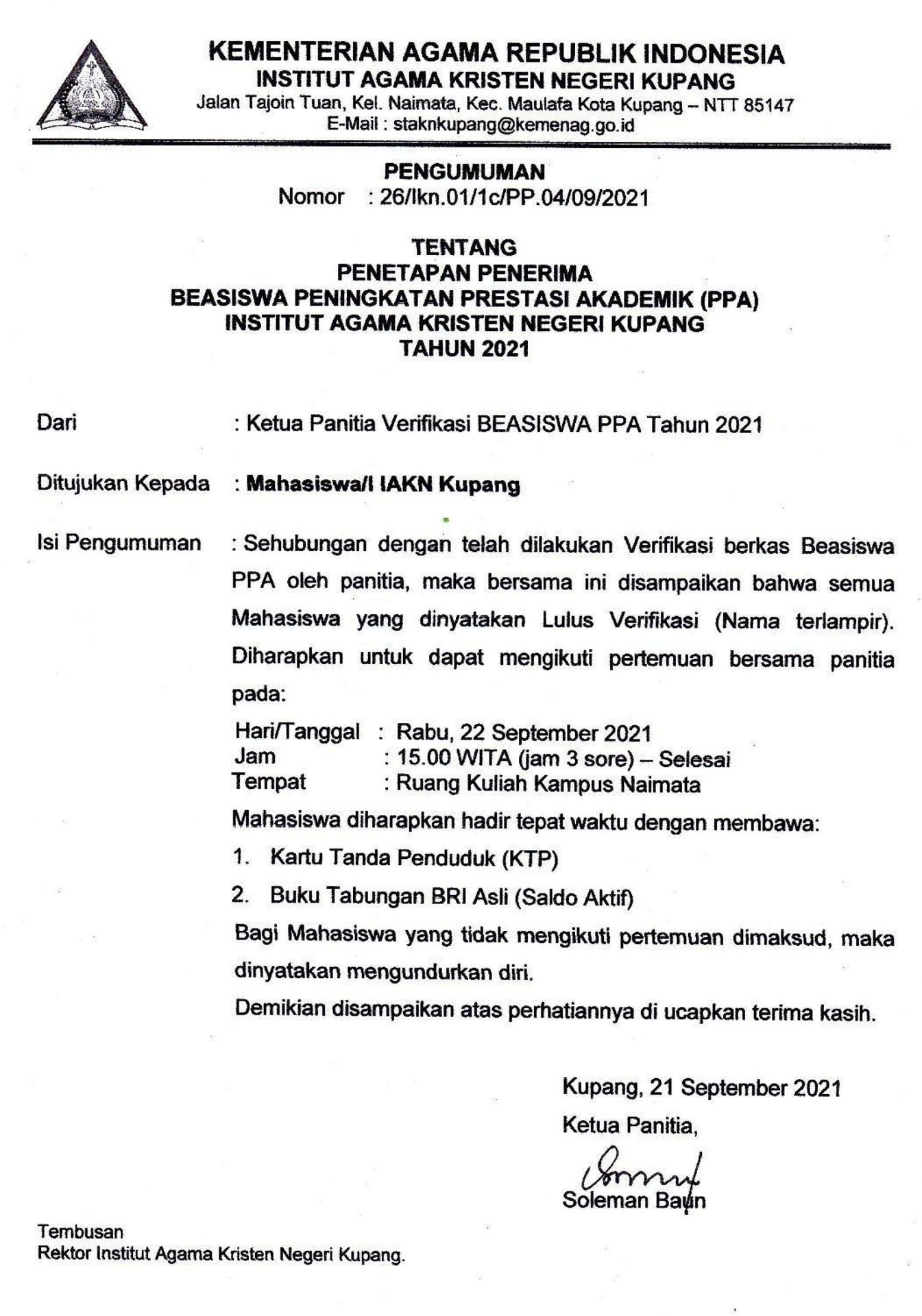 Penetapan Penerima Beasiswa PPA IAKN Kupang Tahun 2021 21 September 2021 07:42 WITA | IAKN Kupang | Berita Kampus Previous Next Lampiran Nama-Nama Silakan Ikuti IAKN Kupang di Social Media Post navigation Sebelumnya: Pengumuman Pelaksanaan Kegiatan Pembekalan Mahasiswa PPL Tahun 2021Selanjutnya: Pembagian Lokasi dan Dosen Pembimbing PPL Mahasiswa IAKN Kupang T.A 2021/2022 Berita Kampus Lainnya Dekan FISKK IAKN Kupang Ajak Civitas Akademika Jaga Produktivitas dan Sinergi dalam Pelayanan 12/11/2024 IAKN Kupang Gelar Upacara Hari Pahlawan, Ajak Civitas Akademika Teladani Semangat Kepahlawanan 12/11/2024 IAKN Kupang Perkuat Kolaborasi Pendidikan Internasional dengan Taiwan 12/11/2024 IAKN Kupang Apresiasi Mahasiswa Berprestasi, Endi Missa Peraih Emas PEPARNAS XVII 11/11/2024 Pengumuman Perpanjangan Pendaftaran Wisuda Tahap II Tahun 2024 04/11/2024 Rektor IAKN Kupang Tekankan 5 Pilar Mentalitas: Membangun SDM Unggul Bersama Pemkab Kupang 31/10/2024 Audiensi IAKN Kupang dan Pemkab Kupang: Sinergi Membangun SDM Unggul dan Kampus Berintegritas 31/10/2024 IAKN Kupang Jalin Kerja Sama dengan Gwacheon Cultural Center, Korea Selatan 30/10/2024 IAKN Kupang Gelar Seminar Nasional Psikologi: Membangun Resiliensi Mental di Era Society 5.0 30/10/2024 Seminar ‘Fatherless: The Way to Find Yourself’ Dorong Pencarian Jati Diri di Tengah Kehilangan Figur Ayah 30/10/2024 Kategori Acara & Tulisan IlmiahBerita KampusSEKILAS IAKN KUPANG Berita Terbaru IAKN Kupang Gelar Ibadah Awal Pekan: Ajak Civitas Akademika Renungkan Orientasi Kerja dalam Iman 12/11/2024 Acara & Tulisan Ilmiah Baca selengkapnya Dekan FISKK IAKN Kupang Ajak Civitas Akademika Jaga Produktivitas dan Sinergi dalam Pelayanan 12/11/2024 Berita Kampus Baca selengkapnya IAKN Kupang Gelar Upacara Hari Pahlawan, Ajak Civitas Akademika Teladani Semangat Kepahlawanan 12/11/2024 Berita Kampus Baca selengkapnya IAKN Kupang Perkuat Kolaborasi Pendidikan Internasional dengan Taiwan 12/11/2024 Berita Kampus Baca selengkapnya