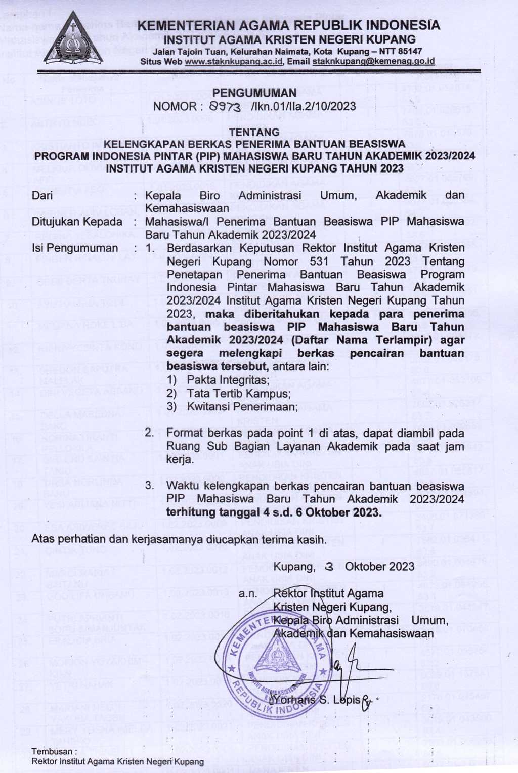 Pengumuman Kelengkapan Berkas Penerima Bantuan Beasiswa PIP MaBa Tahun 2023 3 Oktober 2023 16:36 WITA | IAKN Kupang | Berita Kampus Previous Next Lampiran Pengumuman Kelengkapan BerkasPenerima Bantuan Beasiswa PIP MaBa 2023 Silakan Ikuti IAKN Kupang di Social Media Post navigation Sebelumnya: Rektor IAKN Kupang Berikan Arahan Penting kepada Civitas Akademika: Fokus pada Pendidikan Berkualitas dan Pengembangan InstitusiSelanjutnya: Pendataan Alumni Yang Belum Terlapor Pada PDDikti Oktober 2023 Berita Kampus Lainnya Dekan FISKK IAKN Kupang Ajak Civitas Akademika Jaga Produktivitas dan Sinergi dalam Pelayanan 12/11/2024 IAKN Kupang Gelar Upacara Hari Pahlawan, Ajak Civitas Akademika Teladani Semangat Kepahlawanan 12/11/2024 IAKN Kupang Perkuat Kolaborasi Pendidikan Internasional dengan Taiwan 12/11/2024 IAKN Kupang Apresiasi Mahasiswa Berprestasi, Endi Missa Peraih Emas PEPARNAS XVII 11/11/2024 Pengumuman Perpanjangan Pendaftaran Wisuda Tahap II Tahun 2024 04/11/2024 Rektor IAKN Kupang Tekankan 5 Pilar Mentalitas: Membangun SDM Unggul Bersama Pemkab Kupang 31/10/2024 Audiensi IAKN Kupang dan Pemkab Kupang: Sinergi Membangun SDM Unggul dan Kampus Berintegritas 31/10/2024 IAKN Kupang Jalin Kerja Sama dengan Gwacheon Cultural Center, Korea Selatan 30/10/2024 IAKN Kupang Gelar Seminar Nasional Psikologi: Membangun Resiliensi Mental di Era Society 5.0 30/10/2024 Seminar ‘Fatherless: The Way to Find Yourself’ Dorong Pencarian Jati Diri di Tengah Kehilangan Figur Ayah 30/10/2024 Kategori Acara & Tulisan IlmiahBerita KampusSEKILAS IAKN KUPANG Berita Terbaru IAKN Kupang Gelar Ibadah Awal Pekan: Ajak Civitas Akademika Renungkan Orientasi Kerja dalam Iman 12/11/2024 Acara & Tulisan Ilmiah Baca selengkapnya Dekan FISKK IAKN Kupang Ajak Civitas Akademika Jaga Produktivitas dan Sinergi dalam Pelayanan 12/11/2024 Berita Kampus Baca selengkapnya IAKN Kupang Gelar Upacara Hari Pahlawan, Ajak Civitas Akademika Teladani Semangat Kepahlawanan 12/11/2024 Berita Kampus Baca selengkapnya IAKN Kupang Perkuat Kolaborasi Pendidikan Internasional dengan Taiwan 12/11/2024 Berita Kampus Baca selengkapnya