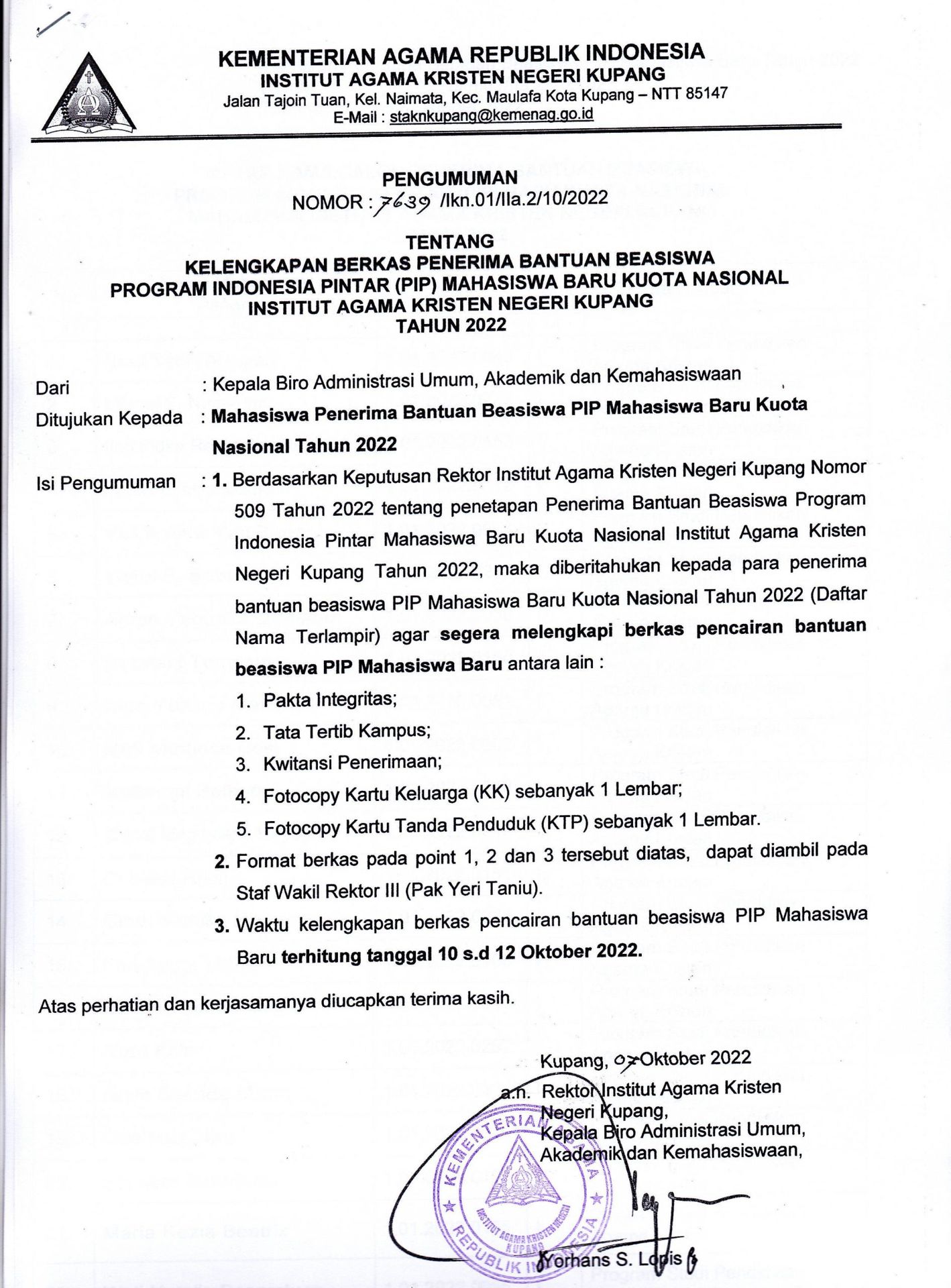 Pengumuman Kelengkapan Berkas Penerima Bantuan Beasiswa PIP Mahasiswa Baru Kuota Nasional Tahun 2022 7 Oktober 2022 07:46 WITA | IAKN Kupang | Berita Kampus Previous Next Lampiran Nama-nama PIP Baru Kuota Nasional 2022 Silakan Ikuti IAKN Kupang di Social Media Post navigation Sebelumnya: Perpanjangan Pendaftaran Wisuda Tahun 2022Selanjutnya: Penjaringan Wakil Rektor Bidang Akademik dan Kelembagaan IAKN Kupang Periode 2022-2024 Berita Kampus Lainnya Dekan FISKK IAKN Kupang Ajak Civitas Akademika Jaga Produktivitas dan Sinergi dalam Pelayanan 12/11/2024 IAKN Kupang Gelar Upacara Hari Pahlawan, Ajak Civitas Akademika Teladani Semangat Kepahlawanan 12/11/2024 IAKN Kupang Perkuat Kolaborasi Pendidikan Internasional dengan Taiwan 12/11/2024 IAKN Kupang Apresiasi Mahasiswa Berprestasi, Endi Missa Peraih Emas PEPARNAS XVII 11/11/2024 Pengumuman Perpanjangan Pendaftaran Wisuda Tahap II Tahun 2024 04/11/2024 Rektor IAKN Kupang Tekankan 5 Pilar Mentalitas: Membangun SDM Unggul Bersama Pemkab Kupang 31/10/2024 Audiensi IAKN Kupang dan Pemkab Kupang: Sinergi Membangun SDM Unggul dan Kampus Berintegritas 31/10/2024 IAKN Kupang Jalin Kerja Sama dengan Gwacheon Cultural Center, Korea Selatan 30/10/2024 IAKN Kupang Gelar Seminar Nasional Psikologi: Membangun Resiliensi Mental di Era Society 5.0 30/10/2024 Seminar ‘Fatherless: The Way to Find Yourself’ Dorong Pencarian Jati Diri di Tengah Kehilangan Figur Ayah 30/10/2024 Kategori Acara & Tulisan IlmiahBerita KampusSEKILAS IAKN KUPANG Berita Terbaru IAKN Kupang Gelar Ibadah Awal Pekan: Ajak Civitas Akademika Renungkan Orientasi Kerja dalam Iman 12/11/2024 Acara & Tulisan Ilmiah Baca selengkapnya Dekan FISKK IAKN Kupang Ajak Civitas Akademika Jaga Produktivitas dan Sinergi dalam Pelayanan 12/11/2024 Berita Kampus Baca selengkapnya IAKN Kupang Gelar Upacara Hari Pahlawan, Ajak Civitas Akademika Teladani Semangat Kepahlawanan 12/11/2024 Berita Kampus Baca selengkapnya IAKN Kupang Perkuat Kolaborasi Pendidikan Internasional dengan Taiwan 12/11/2024 Berita Kampus Baca selengkapnya