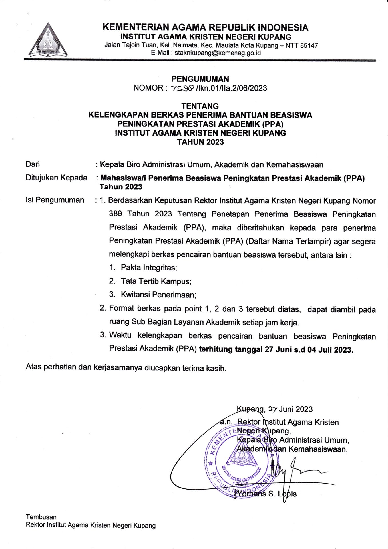 Lampiran Pengumuman Kelengkapan Berkas Beasiswa PPA IAKN KUPANG 2023