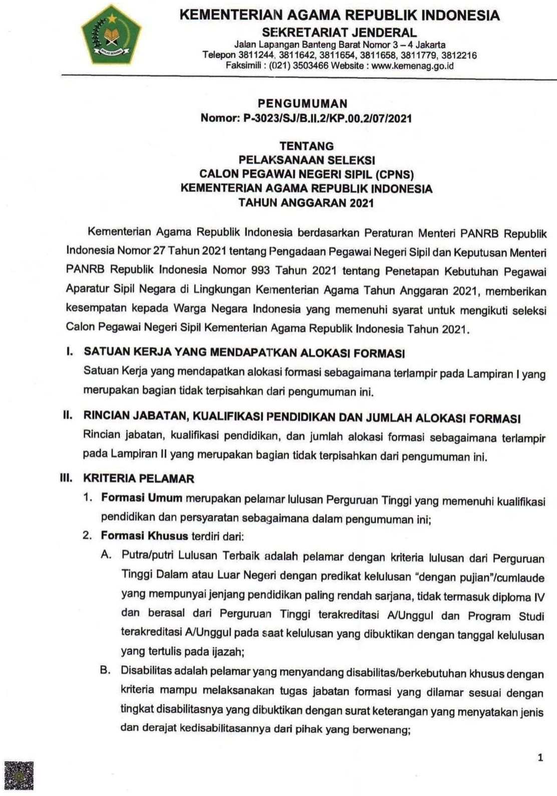 Pengumuman Pelaksanaan Seleksi CPNS Kementerian Agama RI 2021
