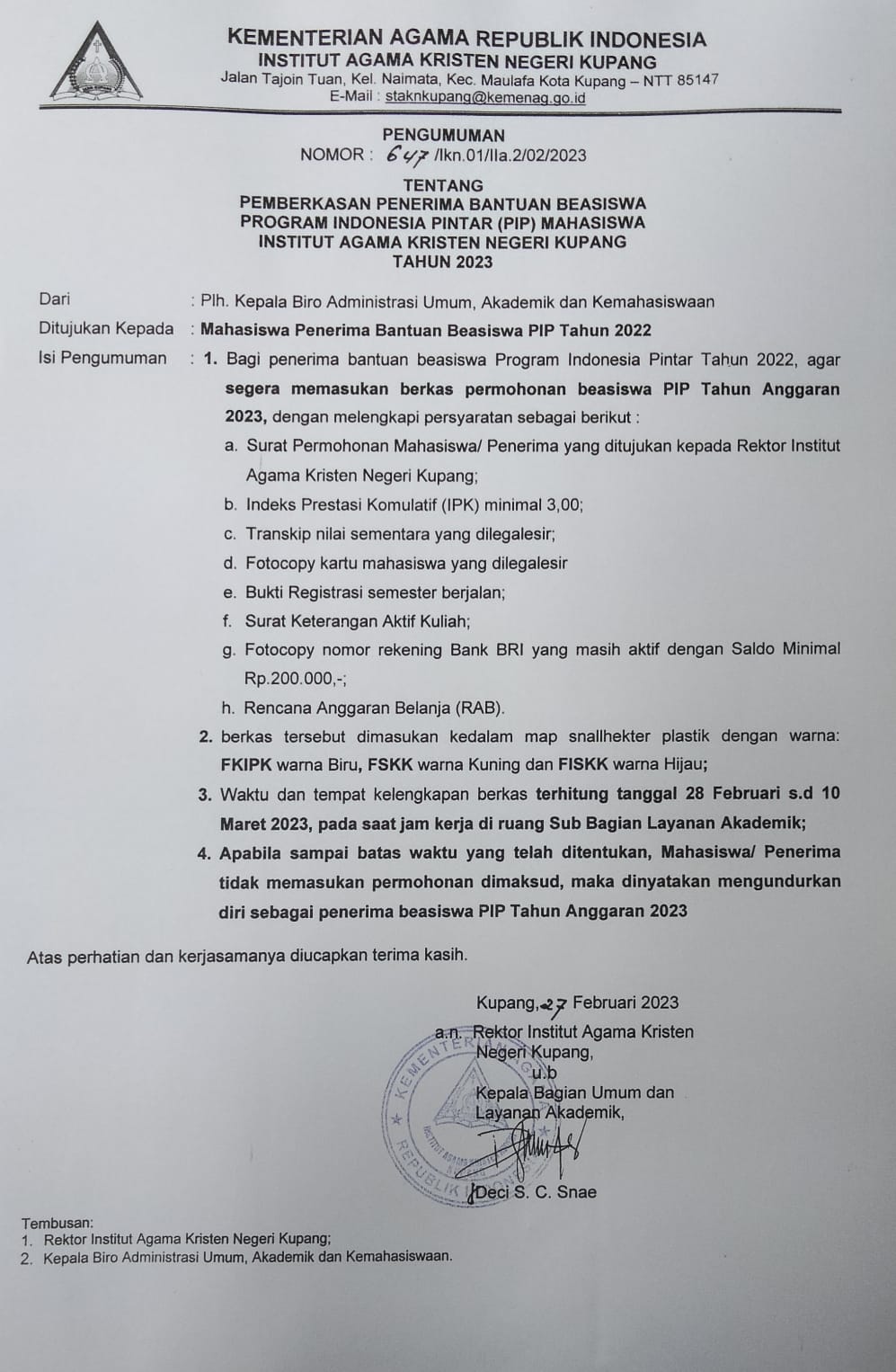 Pengumuman Pemberkasan Penerima Bantuan Beasiswa PIP Tahun 2023 27 Februari 2023 15:30 WITA | IAKN Kupang | Berita Kampus Previous Next Silakan Ikuti IAKN Kupang di Social Media Post navigation Sebelumnya: Kegiatan Pengembangan dan Pelatihan Sistem Pembelajaran Online (Learning Management System) Dosen FISKK IAKN KupangSelanjutnya: Ibadah Pembukaan Kegiatan Rapat Kerja Nasional Ditjen Bimas Kristen Tahun 2023 Berita Kampus Lainnya Dekan FISKK IAKN Kupang Ajak Civitas Akademika Jaga Produktivitas dan Sinergi dalam Pelayanan 12/11/2024 IAKN Kupang Gelar Upacara Hari Pahlawan, Ajak Civitas Akademika Teladani Semangat Kepahlawanan 12/11/2024 IAKN Kupang Perkuat Kolaborasi Pendidikan Internasional dengan Taiwan 12/11/2024 IAKN Kupang Apresiasi Mahasiswa Berprestasi, Endi Missa Peraih Emas PEPARNAS XVII 11/11/2024 Pengumuman Perpanjangan Pendaftaran Wisuda Tahap II Tahun 2024 04/11/2024 Rektor IAKN Kupang Tekankan 5 Pilar Mentalitas: Membangun SDM Unggul Bersama Pemkab Kupang 31/10/2024 Audiensi IAKN Kupang dan Pemkab Kupang: Sinergi Membangun SDM Unggul dan Kampus Berintegritas 31/10/2024 IAKN Kupang Jalin Kerja Sama dengan Gwacheon Cultural Center, Korea Selatan 30/10/2024 IAKN Kupang Gelar Seminar Nasional Psikologi: Membangun Resiliensi Mental di Era Society 5.0 30/10/2024 Seminar ‘Fatherless: The Way to Find Yourself’ Dorong Pencarian Jati Diri di Tengah Kehilangan Figur Ayah 30/10/2024 Kategori Acara & Tulisan IlmiahBerita KampusSEKILAS IAKN KUPANG Berita Terbaru IAKN Kupang Gelar Ibadah Awal Pekan: Ajak Civitas Akademika Renungkan Orientasi Kerja dalam Iman 12/11/2024 Acara & Tulisan Ilmiah Baca selengkapnya Dekan FISKK IAKN Kupang Ajak Civitas Akademika Jaga Produktivitas dan Sinergi dalam Pelayanan 12/11/2024 Berita Kampus Baca selengkapnya IAKN Kupang Gelar Upacara Hari Pahlawan, Ajak Civitas Akademika Teladani Semangat Kepahlawanan 12/11/2024 Berita Kampus Baca selengkapnya IAKN Kupang Perkuat Kolaborasi Pendidikan Internasional dengan Taiwan 12/11/2024 Berita Kampus Baca selengkapnya
