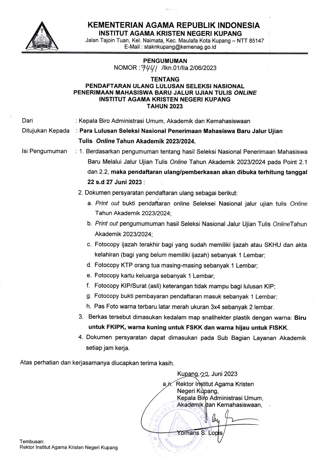 Pengumuman Pendaftaran Ulang SELNAS PMB Jalur Ujian Tulis Online IAKN Kupang Tahun 2023 22 Juni 2023 15:34 WITA | IAKN Kupang | Berita Kampus Previous Next Silakan Ikuti IAKN Kupang di Social Media Post navigation Sebelumnya: PENGUMUMAN KELULUSAN SELNAS – PMB JALUR UJIAN TULIS ONLINE – IAKN KUPANG TAHUN 2023Selanjutnya: PKM Pascasarjana Doktoral IAKN Kupang Tahun 2023 di Kab. TTS Mengusung Tema “Sosialisasi Budaya Manonob Sebagai Kearifan Lokal Pembalajaran Pendidikan Agama Kristen Di Kabupaten Timor Tengah Selatan Berita Kampus Lainnya Dekan FISKK IAKN Kupang Ajak Civitas Akademika Jaga Produktivitas dan Sinergi dalam Pelayanan 12/11/2024 IAKN Kupang Gelar Upacara Hari Pahlawan, Ajak Civitas Akademika Teladani Semangat Kepahlawanan 12/11/2024 IAKN Kupang Perkuat Kolaborasi Pendidikan Internasional dengan Taiwan 12/11/2024 IAKN Kupang Apresiasi Mahasiswa Berprestasi, Endi Missa Peraih Emas PEPARNAS XVII 11/11/2024 Pengumuman Perpanjangan Pendaftaran Wisuda Tahap II Tahun 2024 04/11/2024 Rektor IAKN Kupang Tekankan 5 Pilar Mentalitas: Membangun SDM Unggul Bersama Pemkab Kupang 31/10/2024 Audiensi IAKN Kupang dan Pemkab Kupang: Sinergi Membangun SDM Unggul dan Kampus Berintegritas 31/10/2024 IAKN Kupang Jalin Kerja Sama dengan Gwacheon Cultural Center, Korea Selatan 30/10/2024 IAKN Kupang Gelar Seminar Nasional Psikologi: Membangun Resiliensi Mental di Era Society 5.0 30/10/2024 Seminar ‘Fatherless: The Way to Find Yourself’ Dorong Pencarian Jati Diri di Tengah Kehilangan Figur Ayah 30/10/2024 Kategori Acara & Tulisan IlmiahBerita KampusSEKILAS IAKN KUPANG Berita Terbaru IAKN Kupang Gelar Ibadah Awal Pekan: Ajak Civitas Akademika Renungkan Orientasi Kerja dalam Iman 12/11/2024 Acara & Tulisan Ilmiah Baca selengkapnya Dekan FISKK IAKN Kupang Ajak Civitas Akademika Jaga Produktivitas dan Sinergi dalam Pelayanan 12/11/2024 Berita Kampus Baca selengkapnya IAKN Kupang Gelar Upacara Hari Pahlawan, Ajak Civitas Akademika Teladani Semangat Kepahlawanan 12/11/2024 Berita Kampus Baca selengkapnya IAKN Kupang Perkuat Kolaborasi Pendidikan Internasional dengan Taiwan 12/11/2024 Berita Kampus Baca selengkapnya