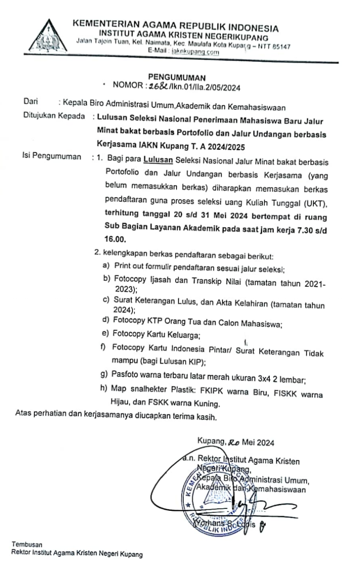 Pengumuman Pendaftaran Ulang SELNAS PMB PTKKN Jalur Minat Bakat Berbasis Portofolio IAKN Kupang 2024 21 Mei 2024 09:30 WITA | IAKN Kupang | Berita Kampus Previous Next Silakan Ikuti IAKN Kupang di Social Media Post navigation Sebelumnya: Penutupan Kegiatan Evaluasi dan Pengembangan Kurikulum IAKN Kupang: Rektor Tekankan Mahasiswa Berdaya Saing dan Beretika Berbasis Kearifan LokalSelanjutnya: Tingkatkan Mutu Publikasi, FSKK IAKN Kupang Gelar FGD Bersama Pakar Ternama Berita Kampus Lainnya Dekan FISKK IAKN Kupang Ajak Civitas Akademika Jaga Produktivitas dan Sinergi dalam Pelayanan 12/11/2024 IAKN Kupang Gelar Upacara Hari Pahlawan, Ajak Civitas Akademika Teladani Semangat Kepahlawanan 12/11/2024 IAKN Kupang Perkuat Kolaborasi Pendidikan Internasional dengan Taiwan 12/11/2024 IAKN Kupang Apresiasi Mahasiswa Berprestasi, Endi Missa Peraih Emas PEPARNAS XVII 11/11/2024 Pengumuman Perpanjangan Pendaftaran Wisuda Tahap II Tahun 2024 04/11/2024 Rektor IAKN Kupang Tekankan 5 Pilar Mentalitas: Membangun SDM Unggul Bersama Pemkab Kupang 31/10/2024 Audiensi IAKN Kupang dan Pemkab Kupang: Sinergi Membangun SDM Unggul dan Kampus Berintegritas 31/10/2024 IAKN Kupang Jalin Kerja Sama dengan Gwacheon Cultural Center, Korea Selatan 30/10/2024 IAKN Kupang Gelar Seminar Nasional Psikologi: Membangun Resiliensi Mental di Era Society 5.0 30/10/2024 Seminar ‘Fatherless: The Way to Find Yourself’ Dorong Pencarian Jati Diri di Tengah Kehilangan Figur Ayah 30/10/2024 Kategori Acara & Tulisan IlmiahBerita KampusSEKILAS IAKN KUPANG Berita Terbaru IAKN Kupang Gelar Ibadah Awal Pekan: Ajak Civitas Akademika Renungkan Orientasi Kerja dalam Iman 12/11/2024 Acara & Tulisan Ilmiah Baca selengkapnya Dekan FISKK IAKN Kupang Ajak Civitas Akademika Jaga Produktivitas dan Sinergi dalam Pelayanan 12/11/2024 Berita Kampus Baca selengkapnya IAKN Kupang Gelar Upacara Hari Pahlawan, Ajak Civitas Akademika Teladani Semangat Kepahlawanan 12/11/2024 Berita Kampus Baca selengkapnya IAKN Kupang Perkuat Kolaborasi Pendidikan Internasional dengan Taiwan 12/11/2024 Berita Kampus Baca selengkapnya