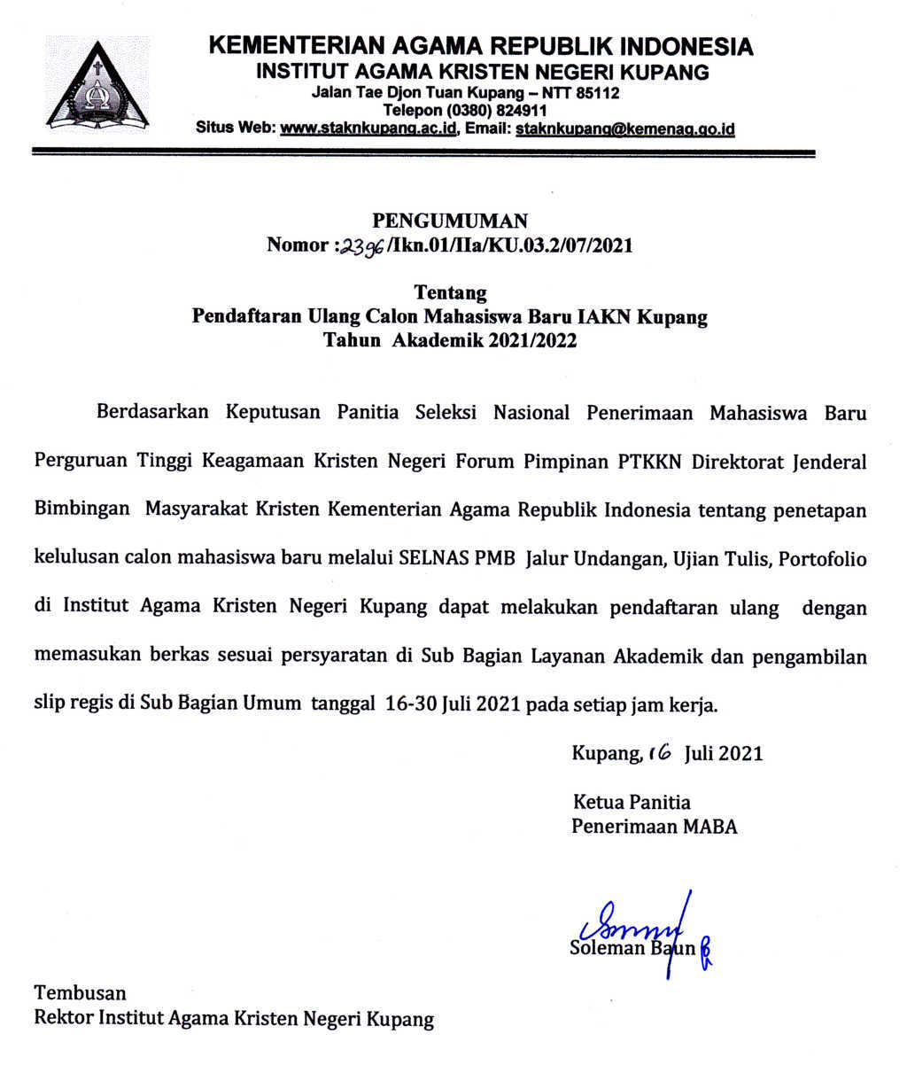 Pengumuman Pendaftaran Ulang SELNAS PTKKN dan Pengambilan Slip Regis 2021 16 Juli 2021 07:02 WITA | IAKN Kupang | Berita Kampus Previous Next Silakan Ikuti IAKN Kupang di Social Media Post navigation Sebelumnya: Pengumuman Pendaftaran Ulang SELNAS PMB IAKN Kupang 2021Selanjutnya: Jadwal Pelaksanaan Ujian Tertulis Penerimaan Mahasiswa Baru Jalur Mandiri IAKN Kupang 2021 Berita Kampus Lainnya Dekan FISKK IAKN Kupang Ajak Civitas Akademika Jaga Produktivitas dan Sinergi dalam Pelayanan 12/11/2024 IAKN Kupang Gelar Upacara Hari Pahlawan, Ajak Civitas Akademika Teladani Semangat Kepahlawanan 12/11/2024 IAKN Kupang Perkuat Kolaborasi Pendidikan Internasional dengan Taiwan 12/11/2024 IAKN Kupang Apresiasi Mahasiswa Berprestasi, Endi Missa Peraih Emas PEPARNAS XVII 11/11/2024 Pengumuman Perpanjangan Pendaftaran Wisuda Tahap II Tahun 2024 04/11/2024 Rektor IAKN Kupang Tekankan 5 Pilar Mentalitas: Membangun SDM Unggul Bersama Pemkab Kupang 31/10/2024 Audiensi IAKN Kupang dan Pemkab Kupang: Sinergi Membangun SDM Unggul dan Kampus Berintegritas 31/10/2024 IAKN Kupang Jalin Kerja Sama dengan Gwacheon Cultural Center, Korea Selatan 30/10/2024 IAKN Kupang Gelar Seminar Nasional Psikologi: Membangun Resiliensi Mental di Era Society 5.0 30/10/2024 Seminar ‘Fatherless: The Way to Find Yourself’ Dorong Pencarian Jati Diri di Tengah Kehilangan Figur Ayah 30/10/2024 Kategori Acara & Tulisan IlmiahBerita KampusSEKILAS IAKN KUPANG Berita Terbaru IAKN Kupang Gelar Ibadah Awal Pekan: Ajak Civitas Akademika Renungkan Orientasi Kerja dalam Iman 12/11/2024 Acara & Tulisan Ilmiah Baca selengkapnya Dekan FISKK IAKN Kupang Ajak Civitas Akademika Jaga Produktivitas dan Sinergi dalam Pelayanan 12/11/2024 Berita Kampus Baca selengkapnya IAKN Kupang Gelar Upacara Hari Pahlawan, Ajak Civitas Akademika Teladani Semangat Kepahlawanan 12/11/2024 Berita Kampus Baca selengkapnya IAKN Kupang Perkuat Kolaborasi Pendidikan Internasional dengan Taiwan 12/11/2024 Berita Kampus Baca selengkapnya