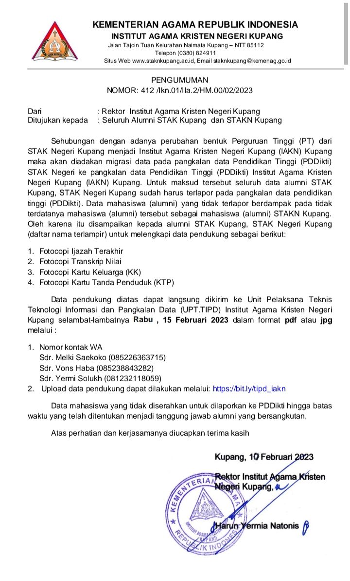 Pengumuman Pendataan Data Alumni STAK Kupang – STAKN Kupang 14 Februari 2023 02:32 WITA | IAKN Kupang | Berita Kampus Previous Next Lampiran Nama-Nama Silakan Ikuti IAKN Kupang di Social Media Post navigation Sebelumnya: Pelatihan Kepemimpinan Administrator Angkatan XII Tahun 2023Selanjutnya: Sosialisasi Pedoman Penyusunan Rencana Pembelajaran Semester di Fakultas Keguruan dan Ilmu Pendidikan Kristen Berita Kampus Lainnya Dekan FISKK IAKN Kupang Ajak Civitas Akademika Jaga Produktivitas dan Sinergi dalam Pelayanan 12/11/2024 IAKN Kupang Gelar Upacara Hari Pahlawan, Ajak Civitas Akademika Teladani Semangat Kepahlawanan 12/11/2024 IAKN Kupang Perkuat Kolaborasi Pendidikan Internasional dengan Taiwan 12/11/2024 IAKN Kupang Apresiasi Mahasiswa Berprestasi, Endi Missa Peraih Emas PEPARNAS XVII 11/11/2024 Pengumuman Perpanjangan Pendaftaran Wisuda Tahap II Tahun 2024 04/11/2024 Rektor IAKN Kupang Tekankan 5 Pilar Mentalitas: Membangun SDM Unggul Bersama Pemkab Kupang 31/10/2024 Audiensi IAKN Kupang dan Pemkab Kupang: Sinergi Membangun SDM Unggul dan Kampus Berintegritas 31/10/2024 IAKN Kupang Jalin Kerja Sama dengan Gwacheon Cultural Center, Korea Selatan 30/10/2024 IAKN Kupang Gelar Seminar Nasional Psikologi: Membangun Resiliensi Mental di Era Society 5.0 30/10/2024 Seminar ‘Fatherless: The Way to Find Yourself’ Dorong Pencarian Jati Diri di Tengah Kehilangan Figur Ayah 30/10/2024 Kategori Acara & Tulisan IlmiahBerita KampusSEKILAS IAKN KUPANG Berita Terbaru IAKN Kupang Gelar Ibadah Awal Pekan: Ajak Civitas Akademika Renungkan Orientasi Kerja dalam Iman 12/11/2024 Acara & Tulisan Ilmiah Baca selengkapnya Dekan FISKK IAKN Kupang Ajak Civitas Akademika Jaga Produktivitas dan Sinergi dalam Pelayanan 12/11/2024 Berita Kampus Baca selengkapnya IAKN Kupang Gelar Upacara Hari Pahlawan, Ajak Civitas Akademika Teladani Semangat Kepahlawanan 12/11/2024 Berita Kampus Baca selengkapnya IAKN Kupang Perkuat Kolaborasi Pendidikan Internasional dengan Taiwan 12/11/2024 Berita Kampus Baca selengkapnya