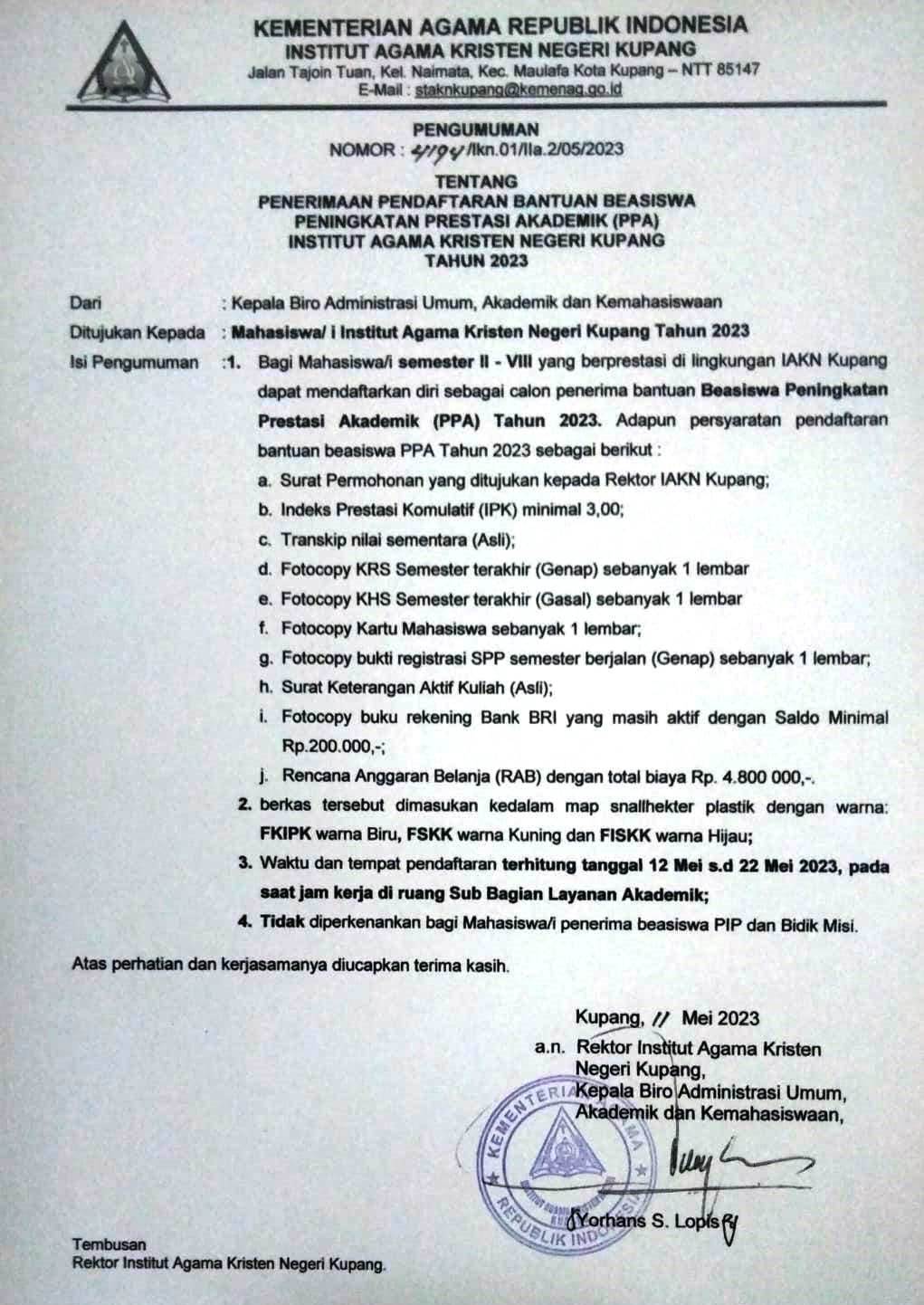 Pengumuman Penerimaan Pendaftaran Bantuan Beasiswa PPA tahun 2023 12 Mei 2023 09:13 WITA | IAKN Kupang | Berita Kampus Previous Next Silakan Ikuti IAKN Kupang di Social Media Post navigation Sebelumnya: Rektor IAKN Kupang Melantik Beberapa Pejabat di Lingkungan IAKN KupangSelanjutnya: Rektor IAKN Kupang Menyampaikan Arahan Dalam Ibadah Awal Pekan Pada Senin, 15 Mei 2023 Berita Kampus Lainnya Dekan FISKK IAKN Kupang Ajak Civitas Akademika Jaga Produktivitas dan Sinergi dalam Pelayanan 12/11/2024 IAKN Kupang Gelar Upacara Hari Pahlawan, Ajak Civitas Akademika Teladani Semangat Kepahlawanan 12/11/2024 IAKN Kupang Perkuat Kolaborasi Pendidikan Internasional dengan Taiwan 12/11/2024 IAKN Kupang Apresiasi Mahasiswa Berprestasi, Endi Missa Peraih Emas PEPARNAS XVII 11/11/2024 Pengumuman Perpanjangan Pendaftaran Wisuda Tahap II Tahun 2024 04/11/2024 Rektor IAKN Kupang Tekankan 5 Pilar Mentalitas: Membangun SDM Unggul Bersama Pemkab Kupang 31/10/2024 Audiensi IAKN Kupang dan Pemkab Kupang: Sinergi Membangun SDM Unggul dan Kampus Berintegritas 31/10/2024 IAKN Kupang Jalin Kerja Sama dengan Gwacheon Cultural Center, Korea Selatan 30/10/2024 IAKN Kupang Gelar Seminar Nasional Psikologi: Membangun Resiliensi Mental di Era Society 5.0 30/10/2024 Seminar ‘Fatherless: The Way to Find Yourself’ Dorong Pencarian Jati Diri di Tengah Kehilangan Figur Ayah 30/10/2024 Kategori Acara & Tulisan IlmiahBerita KampusSEKILAS IAKN KUPANG Berita Terbaru IAKN Kupang Gelar Ibadah Awal Pekan: Ajak Civitas Akademika Renungkan Orientasi Kerja dalam Iman 12/11/2024 Acara & Tulisan Ilmiah Baca selengkapnya Dekan FISKK IAKN Kupang Ajak Civitas Akademika Jaga Produktivitas dan Sinergi dalam Pelayanan 12/11/2024 Berita Kampus Baca selengkapnya IAKN Kupang Gelar Upacara Hari Pahlawan, Ajak Civitas Akademika Teladani Semangat Kepahlawanan 12/11/2024 Berita Kampus Baca selengkapnya IAKN Kupang Perkuat Kolaborasi Pendidikan Internasional dengan Taiwan 12/11/2024 Berita Kampus Baca selengkapnya