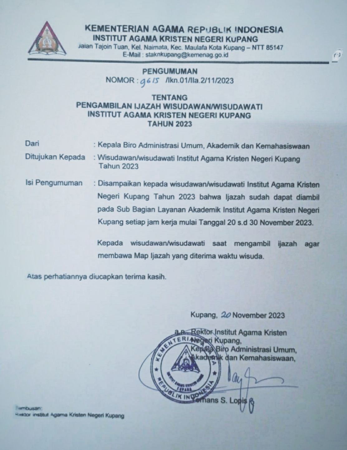 Pengumuman Pengambilan Ijazah Wisudawan/wati Tahun 2023 21 November 2023 23:03 WITA | IAKN Kupang | Berita Kampus Previous Next Silakan Ikuti IAKN Kupang di Social Media Post navigation Sebelumnya: “Meskipun sibuk dalam banyak hal, tetap perhatikan kualitas kerjamu. Jika kita bekerja dibawah SOP maka pekerjaan kita belum maksimal”: Ucap Kepala Biro AUAK dalam ArahannyaSelanjutnya: Lomba Cipta Kreasi Media Pembelajaran dan Penyuluhan: FKIPK IAKN Kupang Berita Kampus Lainnya Dekan FISKK IAKN Kupang Ajak Civitas Akademika Jaga Produktivitas dan Sinergi dalam Pelayanan 12/11/2024 IAKN Kupang Gelar Upacara Hari Pahlawan, Ajak Civitas Akademika Teladani Semangat Kepahlawanan 12/11/2024 IAKN Kupang Perkuat Kolaborasi Pendidikan Internasional dengan Taiwan 12/11/2024 IAKN Kupang Apresiasi Mahasiswa Berprestasi, Endi Missa Peraih Emas PEPARNAS XVII 11/11/2024 Pengumuman Perpanjangan Pendaftaran Wisuda Tahap II Tahun 2024 04/11/2024 Rektor IAKN Kupang Tekankan 5 Pilar Mentalitas: Membangun SDM Unggul Bersama Pemkab Kupang 31/10/2024 Audiensi IAKN Kupang dan Pemkab Kupang: Sinergi Membangun SDM Unggul dan Kampus Berintegritas 31/10/2024 IAKN Kupang Jalin Kerja Sama dengan Gwacheon Cultural Center, Korea Selatan 30/10/2024 IAKN Kupang Gelar Seminar Nasional Psikologi: Membangun Resiliensi Mental di Era Society 5.0 30/10/2024 Seminar ‘Fatherless: The Way to Find Yourself’ Dorong Pencarian Jati Diri di Tengah Kehilangan Figur Ayah 30/10/2024 Kategori Acara & Tulisan IlmiahBerita KampusSEKILAS IAKN KUPANG Berita Terbaru IAKN Kupang Gelar Ibadah Awal Pekan: Ajak Civitas Akademika Renungkan Orientasi Kerja dalam Iman 12/11/2024 Acara & Tulisan Ilmiah Baca selengkapnya Dekan FISKK IAKN Kupang Ajak Civitas Akademika Jaga Produktivitas dan Sinergi dalam Pelayanan 12/11/2024 Berita Kampus Baca selengkapnya IAKN Kupang Gelar Upacara Hari Pahlawan, Ajak Civitas Akademika Teladani Semangat Kepahlawanan 12/11/2024 Berita Kampus Baca selengkapnya IAKN Kupang Perkuat Kolaborasi Pendidikan Internasional dengan Taiwan 12/11/2024 Berita Kampus Baca selengkapnya