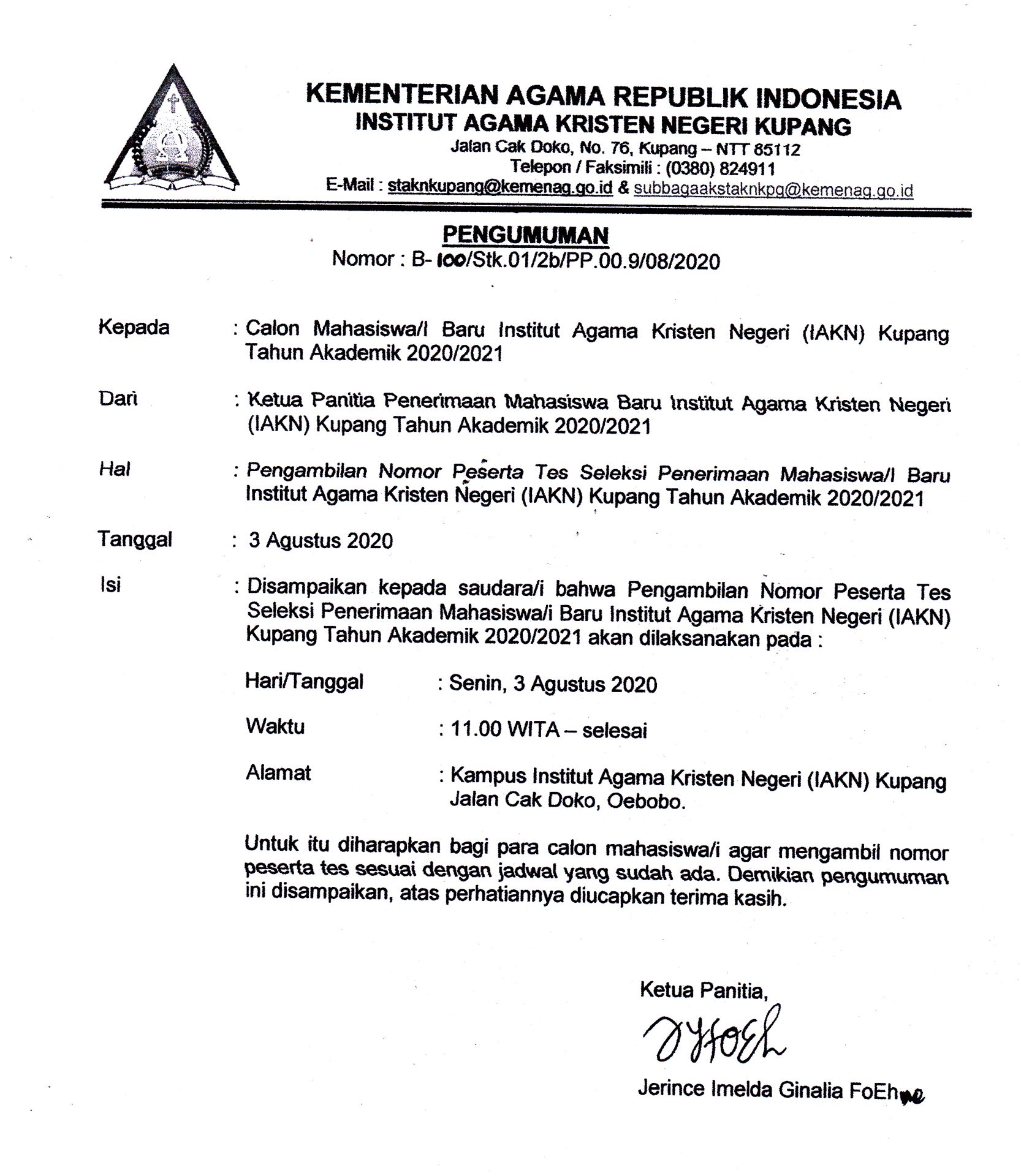 Pengumuman Pengambilan Nomor Peserta Tes Seleksi PMB Jalur Mandiri 2020 3 Agustus 2020 06:31 WITA | IAKN Kupang | Acara & Tulisan Ilmiah Previous Next Pelayanan Pengambilan Nomor Tes Mulai dari hari Senin, 03 s/d 05 Agustus 2020. Silakan Ikuti IAKN Kupang di Social Media Post navigation Sebelumnya: Pengumuman Perpanjang Pendaftaran Mahasiswa Baru Jalur Mandiri T.A 2020/2021Selanjutnya: Penetapan Kelulusan Hasil Seleksi PMB Jalur Mandiri IAKN Kupang 2020 Acara & Tulisan Ilmiah Lainnya IAKN Kupang Gelar Ibadah Awal Pekan: Ajak Civitas Akademika Renungkan Orientasi Kerja dalam Iman 12/11/2024 Mendorong Inovasi Pendidikan: Arahan Dekan FKIPK di Apel Pagi Jadi Sorotan 24/10/2024 Apel Kesadaran di Lingkup IAKN Kupang, Rektor Tekankan Disiplin dan Komitmen dalam Melaksanakan Tanggung Jawab 19/10/2024 MEMOTRET HARI INI, MEMBIDIK MASA DEPAN: Membaca Perubahan Mentalitas. Oleh: I Made Suardana 08/10/2024 Apel Pagi IAKN Kupang: Semangat Baru Menuju Masa Depan Gemilang 02/10/2024 Rektor IAKN Kupang : “Masa Depan dan Harapan Harus Dikerjakan Hari Ini untuk Esok yang Lebih Baik” 09/09/2024 Plt. WR I, Marla M. Djami, M.Si Tekankan Pentingnya Persiapan Akademik dalam Arahan Apel Pagi IAKN Kupang 09/09/2024 Call For Paper Tingkat Nasional 04/09/2024 Plt. Dekan FISKK IAKN Kupang Tegaskan Persiapan Kegiatan Akademik dan Kegiatan Kampus di Apel Pagi 03/09/2024 Apel Pagi Pada Senin, 19 Agustus 2024: Kepala Biro AUAK Dorong Keaktifan dalam Kepanitiaan 19/08/2024 Kategori Acara & Tulisan IlmiahBerita KampusSEKILAS IAKN KUPANG Berita Terbaru IAKN Kupang Gelar Ibadah Awal Pekan: Ajak Civitas Akademika Renungkan Orientasi Kerja dalam Iman 12/11/2024 Acara & Tulisan Ilmiah Baca selengkapnya Dekan FISKK IAKN Kupang Ajak Civitas Akademika Jaga Produktivitas dan Sinergi dalam Pelayanan 12/11/2024 Berita Kampus Baca selengkapnya IAKN Kupang Gelar Upacara Hari Pahlawan, Ajak Civitas Akademika Teladani Semangat Kepahlawanan 12/11/2024 Berita Kampus Baca selengkapnya IAKN Kupang Perkuat Kolaborasi Pendidikan Internasional dengan Taiwan 12/11/2024 Berita Kampus Baca selengkapnya