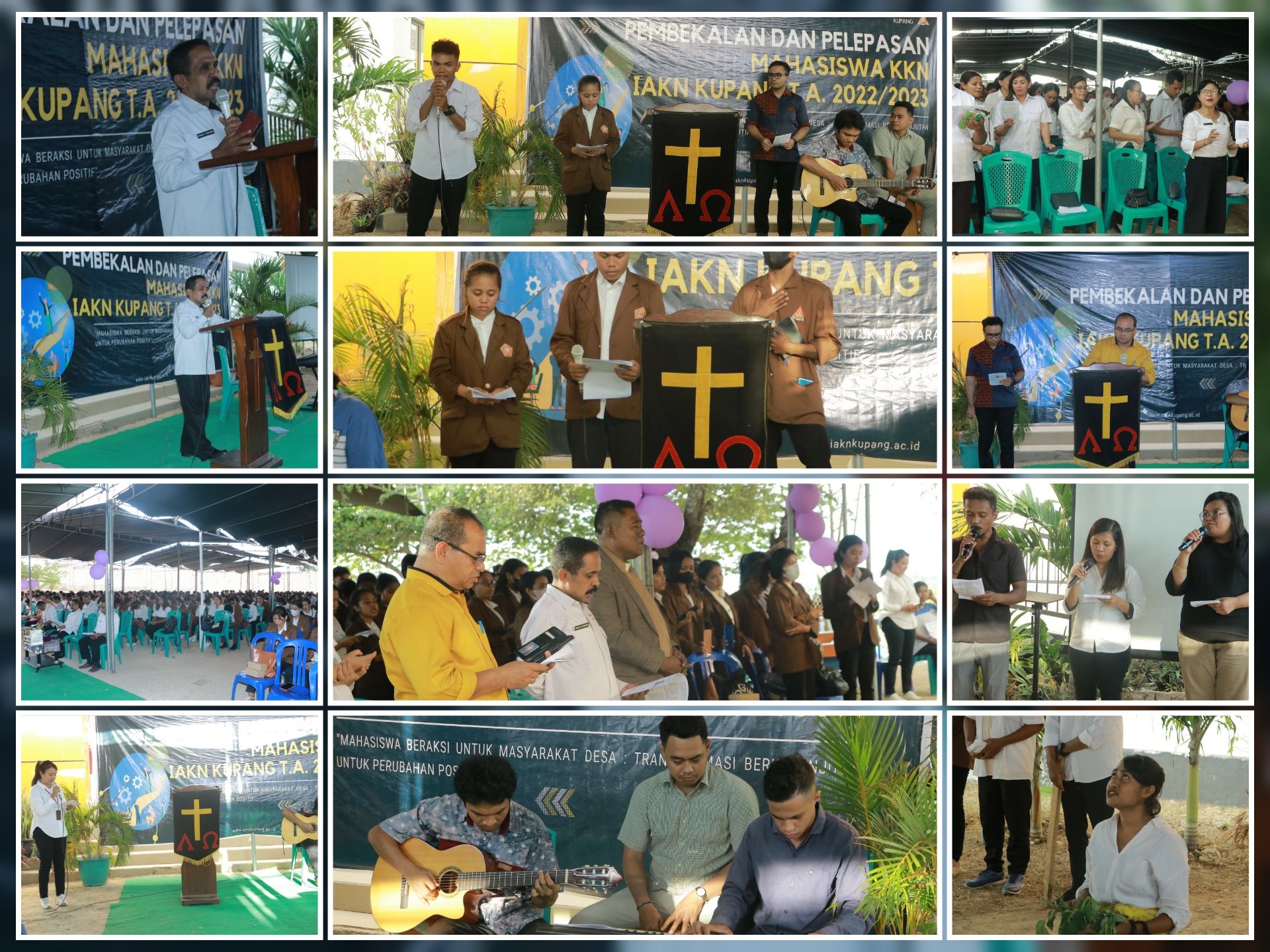 Panitia Kuliah Kerja Nyata (KKN) Institut Agama Kristen Negeri Kupang mengadakan Ibadah Pelepasan pada Selasa, 27 Juni 2023 setelah pembekalan. Ibadah ini dihadiri oleh Rektor IAKN Kupang (Dr. Harun Y. Natonis, M.Si), Wakil Rektor II (Maxy Lak’apu, M.Pd.K), Kepala Biro AUAK (Drs. Yorhans S.Lopis, M.Si), Dekan FKIPK (Kristian E.Y.M.Afi, M.Pd.K), Dekan FSKK (Hemi D. Bara Pa, M.Pd.K), Para Wakil Dekan, Para Kasubbag, Seluruh Dosen Pendamping Lapangan (DPL), dan Mahasiswa KKN IAKN Kupang Tahun 2023.