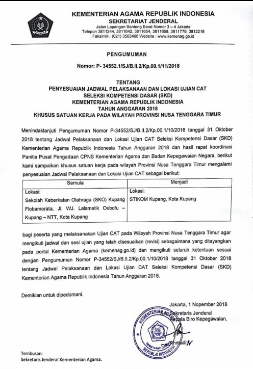 Penyesuaian Jadwal Pelaksanaan dan Lokasi Ujian CAT Seleksi Kompetensi Dasar (SKD) Kementerian Agama Tahun 2018 Khusus Satuan Kerja Pada Wilayah Provinsi Nusa Tenggara Timur (NTT) 1 November 2018 21:44 WITA | IAKN Kupang | Berita Kampus Previous Next Klik pada link berikut untuk melihat pengumuman Download Lampiran Daftar peserta SKD Prov. NTT di sini Silakan Ikuti IAKN Kupang di Social Media Post navigation Sebelumnya: Pemberitahuan CAT BKD KEMENAG RI Pada STAKN Kupang Tahun 2018Selanjutnya: Kuliah Umum “Penguatan Tata Kelola PTKN dalam Menghadapi Era Milenial” Berita Kampus Lainnya Dekan FISKK IAKN Kupang Ajak Civitas Akademika Jaga Produktivitas dan Sinergi dalam Pelayanan 12/11/2024 IAKN Kupang Gelar Upacara Hari Pahlawan, Ajak Civitas Akademika Teladani Semangat Kepahlawanan 12/11/2024 IAKN Kupang Perkuat Kolaborasi Pendidikan Internasional dengan Taiwan 12/11/2024 IAKN Kupang Apresiasi Mahasiswa Berprestasi, Endi Missa Peraih Emas PEPARNAS XVII 11/11/2024 Pengumuman Perpanjangan Pendaftaran Wisuda Tahap II Tahun 2024 04/11/2024 Rektor IAKN Kupang Tekankan 5 Pilar Mentalitas: Membangun SDM Unggul Bersama Pemkab Kupang 31/10/2024 Audiensi IAKN Kupang dan Pemkab Kupang: Sinergi Membangun SDM Unggul dan Kampus Berintegritas 31/10/2024 IAKN Kupang Jalin Kerja Sama dengan Gwacheon Cultural Center, Korea Selatan 30/10/2024 IAKN Kupang Gelar Seminar Nasional Psikologi: Membangun Resiliensi Mental di Era Society 5.0 30/10/2024 Seminar ‘Fatherless: The Way to Find Yourself’ Dorong Pencarian Jati Diri di Tengah Kehilangan Figur Ayah 30/10/2024 Kategori Acara & Tulisan IlmiahBerita KampusSEKILAS IAKN KUPANG Berita Terbaru IAKN Kupang Gelar Ibadah Awal Pekan: Ajak Civitas Akademika Renungkan Orientasi Kerja dalam Iman 12/11/2024 Acara & Tulisan Ilmiah Baca selengkapnya Dekan FISKK IAKN Kupang Ajak Civitas Akademika Jaga Produktivitas dan Sinergi dalam Pelayanan 12/11/2024 Berita Kampus Baca selengkapnya IAKN Kupang Gelar Upacara Hari Pahlawan, Ajak Civitas Akademika Teladani Semangat Kepahlawanan 12/11/2024 Berita Kampus Baca selengkapnya IAKN Kupang Perkuat Kolaborasi Pendidikan Internasional dengan Taiwan 12/11/2024 Berita Kampus Baca selengkapnya