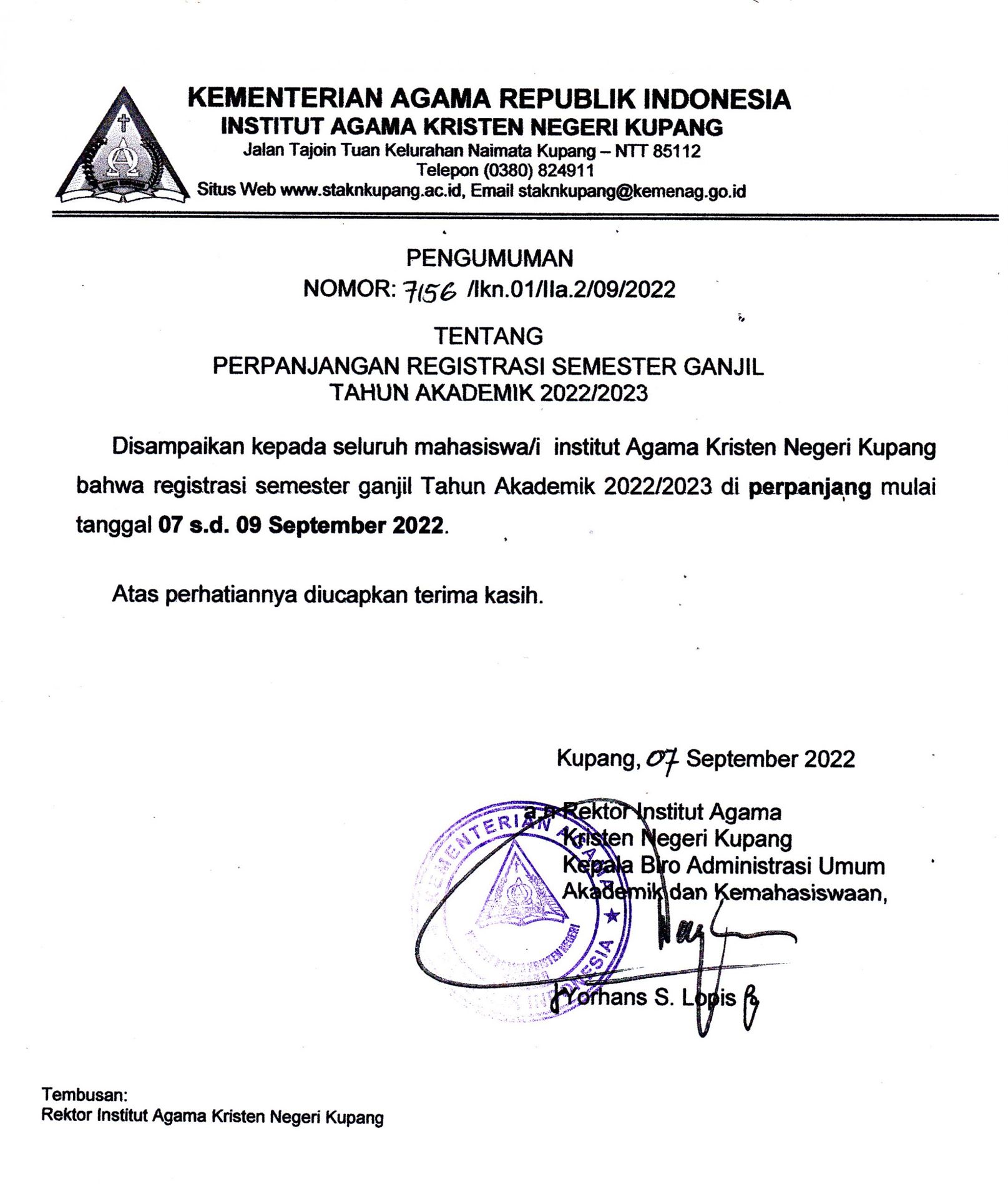 Perpanjang Registrasi Semester Ganjil T.A 2022/2023 8 September 2022 07:18 WITA | IAKN Kupang | Berita Kampus Previous Next Silakan Ikuti IAKN Kupang di Social Media Post navigation Sebelumnya: Pembukaan Pendaftaran Beasiswa PIP Mahasiswa Baru Tahun Akademik 2022/2023Selanjutnya: Pemberitahuan Pemeriksaan Data (Validasi Data) Berita Kampus Lainnya Dekan FISKK IAKN Kupang Ajak Civitas Akademika Jaga Produktivitas dan Sinergi dalam Pelayanan 12/11/2024 IAKN Kupang Gelar Upacara Hari Pahlawan, Ajak Civitas Akademika Teladani Semangat Kepahlawanan 12/11/2024 IAKN Kupang Perkuat Kolaborasi Pendidikan Internasional dengan Taiwan 12/11/2024 IAKN Kupang Apresiasi Mahasiswa Berprestasi, Endi Missa Peraih Emas PEPARNAS XVII 11/11/2024 Pengumuman Perpanjangan Pendaftaran Wisuda Tahap II Tahun 2024 04/11/2024 Rektor IAKN Kupang Tekankan 5 Pilar Mentalitas: Membangun SDM Unggul Bersama Pemkab Kupang 31/10/2024 Audiensi IAKN Kupang dan Pemkab Kupang: Sinergi Membangun SDM Unggul dan Kampus Berintegritas 31/10/2024 IAKN Kupang Jalin Kerja Sama dengan Gwacheon Cultural Center, Korea Selatan 30/10/2024 IAKN Kupang Gelar Seminar Nasional Psikologi: Membangun Resiliensi Mental di Era Society 5.0 30/10/2024 Seminar ‘Fatherless: The Way to Find Yourself’ Dorong Pencarian Jati Diri di Tengah Kehilangan Figur Ayah 30/10/2024 Kategori Acara & Tulisan IlmiahBerita KampusSEKILAS IAKN KUPANG Berita Terbaru IAKN Kupang Gelar Ibadah Awal Pekan: Ajak Civitas Akademika Renungkan Orientasi Kerja dalam Iman 12/11/2024 Acara & Tulisan Ilmiah Baca selengkapnya Dekan FISKK IAKN Kupang Ajak Civitas Akademika Jaga Produktivitas dan Sinergi dalam Pelayanan 12/11/2024 Berita Kampus Baca selengkapnya IAKN Kupang Gelar Upacara Hari Pahlawan, Ajak Civitas Akademika Teladani Semangat Kepahlawanan 12/11/2024 Berita Kampus Baca selengkapnya IAKN Kupang Perkuat Kolaborasi Pendidikan Internasional dengan Taiwan 12/11/2024 Berita Kampus Baca selengkapnya