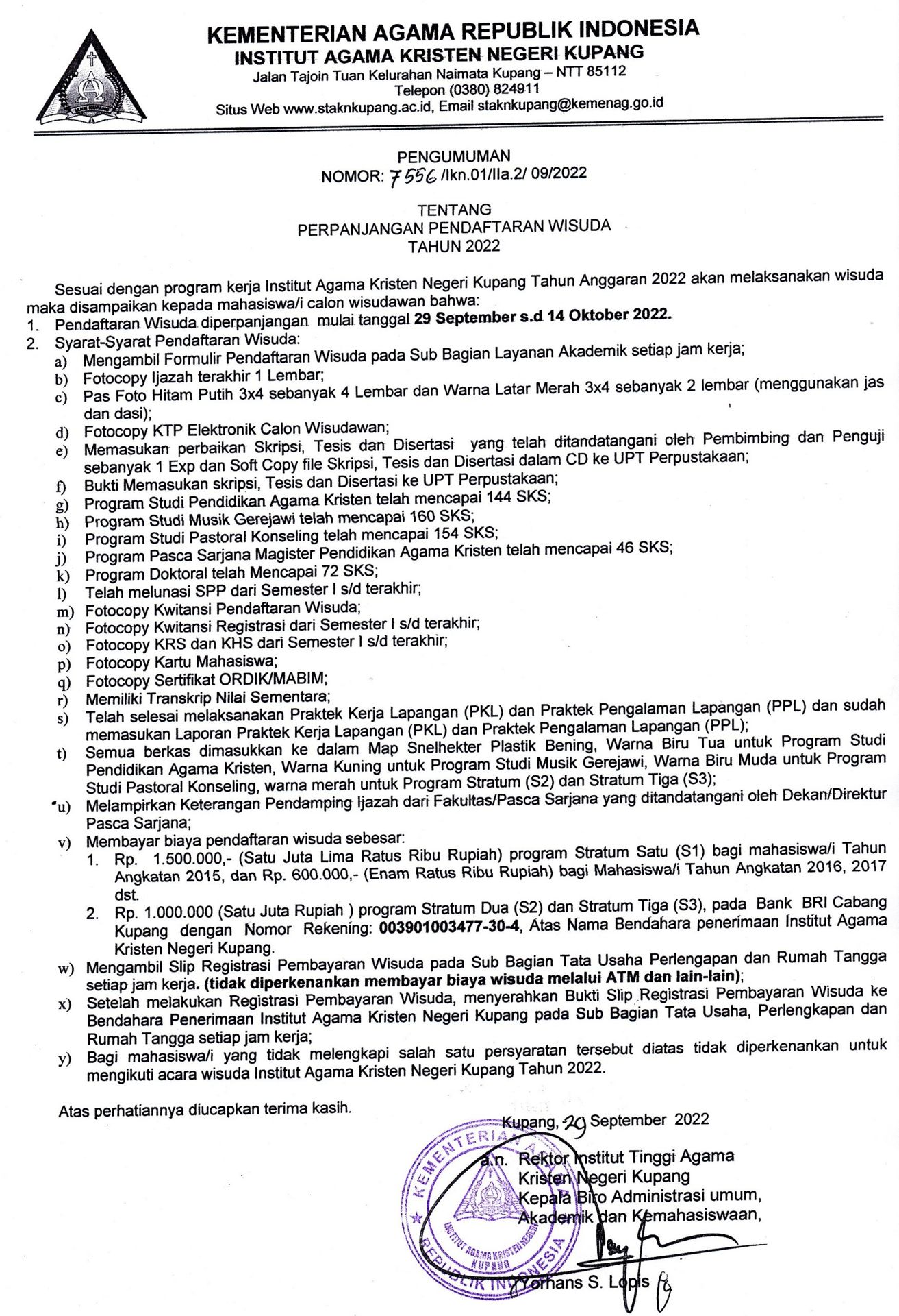 Perpanjangan Pendaftaran Wisuda Tahun 2022 29 September 2022 07:26 WITA | IAKN Kupang | Berita Kampus Previous Next Silakan Ikuti IAKN Kupang di Social Media Post navigation Sebelumnya: Pemberitahuan Pelaksanaan Wisuda 2022Selanjutnya: Pengumuman Kelengkapan Berkas Penerima Bantuan Beasiswa PIP Mahasiswa Baru Kuota Nasional Tahun 2022 Berita Kampus Lainnya Dekan FISKK IAKN Kupang Ajak Civitas Akademika Jaga Produktivitas dan Sinergi dalam Pelayanan 12/11/2024 IAKN Kupang Gelar Upacara Hari Pahlawan, Ajak Civitas Akademika Teladani Semangat Kepahlawanan 12/11/2024 IAKN Kupang Perkuat Kolaborasi Pendidikan Internasional dengan Taiwan 12/11/2024 IAKN Kupang Apresiasi Mahasiswa Berprestasi, Endi Missa Peraih Emas PEPARNAS XVII 11/11/2024 Pengumuman Perpanjangan Pendaftaran Wisuda Tahap II Tahun 2024 04/11/2024 Rektor IAKN Kupang Tekankan 5 Pilar Mentalitas: Membangun SDM Unggul Bersama Pemkab Kupang 31/10/2024 Audiensi IAKN Kupang dan Pemkab Kupang: Sinergi Membangun SDM Unggul dan Kampus Berintegritas 31/10/2024 IAKN Kupang Jalin Kerja Sama dengan Gwacheon Cultural Center, Korea Selatan 30/10/2024 IAKN Kupang Gelar Seminar Nasional Psikologi: Membangun Resiliensi Mental di Era Society 5.0 30/10/2024 Seminar ‘Fatherless: The Way to Find Yourself’ Dorong Pencarian Jati Diri di Tengah Kehilangan Figur Ayah 30/10/2024 Kategori Acara & Tulisan IlmiahBerita KampusSEKILAS IAKN KUPANG Berita Terbaru IAKN Kupang Gelar Ibadah Awal Pekan: Ajak Civitas Akademika Renungkan Orientasi Kerja dalam Iman 12/11/2024 Acara & Tulisan Ilmiah Baca selengkapnya Dekan FISKK IAKN Kupang Ajak Civitas Akademika Jaga Produktivitas dan Sinergi dalam Pelayanan 12/11/2024 Berita Kampus Baca selengkapnya IAKN Kupang Gelar Upacara Hari Pahlawan, Ajak Civitas Akademika Teladani Semangat Kepahlawanan 12/11/2024 Berita Kampus Baca selengkapnya IAKN Kupang Perkuat Kolaborasi Pendidikan Internasional dengan Taiwan 12/11/2024 Berita Kampus Baca selengkapnya
