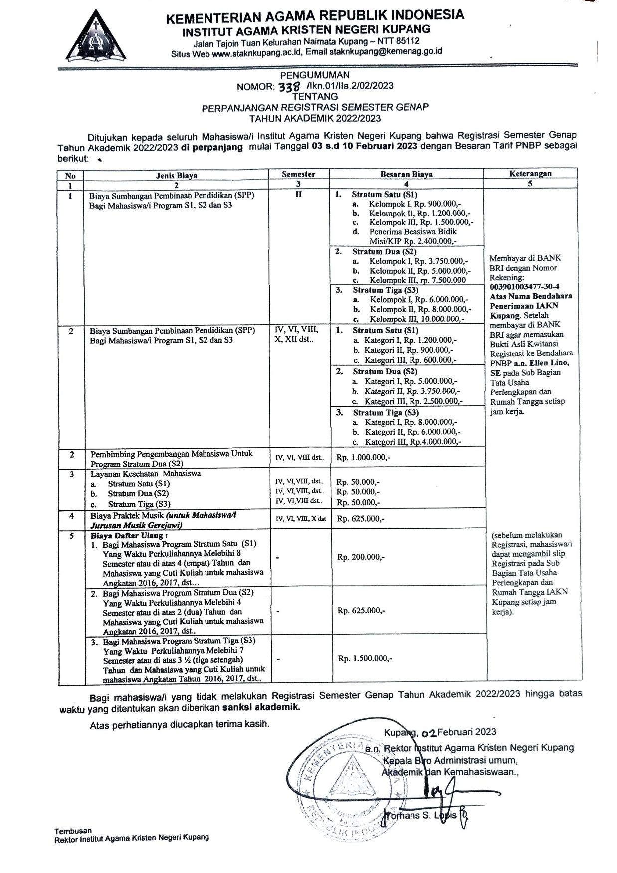 Perpanjangan Registrasi Semester Genap T.A 2022/2023 2 Februari 2023 12:12 WITA | IAKN Kupang | Berita Kampus Previous Next Silakan Ikuti IAKN Kupang di Social Media Post navigation Sebelumnya: Penutupan Semester Ganjil T.A 2022/2023 dan Hari Amal Bhakti ke – 77 Kementerian Agama Republik Indonesia serta Pembukaan Semester Genap T.A 2022/2023Selanjutnya: Rapat Kerja Nasional (RAKERNAS) Kementerian Agama Tahun 2023 Berita Kampus Lainnya Dekan FISKK IAKN Kupang Ajak Civitas Akademika Jaga Produktivitas dan Sinergi dalam Pelayanan 12/11/2024 IAKN Kupang Gelar Upacara Hari Pahlawan, Ajak Civitas Akademika Teladani Semangat Kepahlawanan 12/11/2024 IAKN Kupang Perkuat Kolaborasi Pendidikan Internasional dengan Taiwan 12/11/2024 IAKN Kupang Apresiasi Mahasiswa Berprestasi, Endi Missa Peraih Emas PEPARNAS XVII 11/11/2024 Pengumuman Perpanjangan Pendaftaran Wisuda Tahap II Tahun 2024 04/11/2024 Rektor IAKN Kupang Tekankan 5 Pilar Mentalitas: Membangun SDM Unggul Bersama Pemkab Kupang 31/10/2024 Audiensi IAKN Kupang dan Pemkab Kupang: Sinergi Membangun SDM Unggul dan Kampus Berintegritas 31/10/2024 IAKN Kupang Jalin Kerja Sama dengan Gwacheon Cultural Center, Korea Selatan 30/10/2024 IAKN Kupang Gelar Seminar Nasional Psikologi: Membangun Resiliensi Mental di Era Society 5.0 30/10/2024 Seminar ‘Fatherless: The Way to Find Yourself’ Dorong Pencarian Jati Diri di Tengah Kehilangan Figur Ayah 30/10/2024 Kategori Acara & Tulisan IlmiahBerita KampusSEKILAS IAKN KUPANG Berita Terbaru IAKN Kupang Gelar Ibadah Awal Pekan: Ajak Civitas Akademika Renungkan Orientasi Kerja dalam Iman 12/11/2024 Acara & Tulisan Ilmiah Baca selengkapnya Dekan FISKK IAKN Kupang Ajak Civitas Akademika Jaga Produktivitas dan Sinergi dalam Pelayanan 12/11/2024 Berita Kampus Baca selengkapnya IAKN Kupang Gelar Upacara Hari Pahlawan, Ajak Civitas Akademika Teladani Semangat Kepahlawanan 12/11/2024 Berita Kampus Baca selengkapnya IAKN Kupang Perkuat Kolaborasi Pendidikan Internasional dengan Taiwan 12/11/2024 Berita Kampus Baca selengkapnya