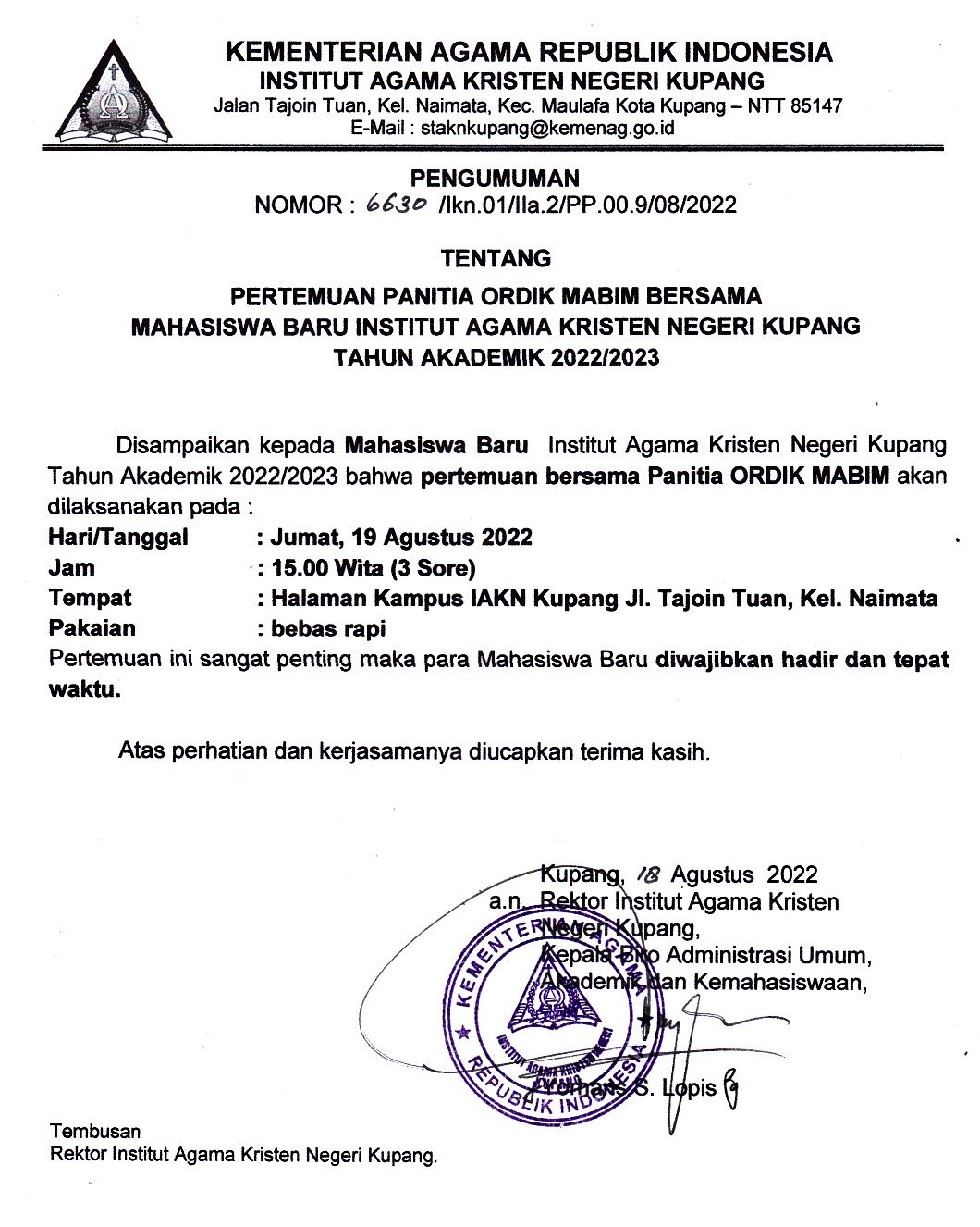 Pertemuan Panitia Ordik Mabim Bersama Mahasiswa Baru Tahun 2022 18 Agustus 2022 07:47 WITA | IAKN Kupang | Acara & Tulisan Ilmiah Previous Next Silakan Ikuti IAKN Kupang di Social Media Post navigation Sebelumnya: Penetapan Uang Kuliah Tunggal dan Registrasi Ulang Mahasiswa Baru Jalur Mandiri Gelombang Ke-II Tahun 2022Selanjutnya: Pelaksanaan Kegiatan Ordik Mabim Mahasiswa Baru Tahun 2022 Acara & Tulisan Ilmiah Lainnya IAKN Kupang Gelar Ibadah Awal Pekan: Ajak Civitas Akademika Renungkan Orientasi Kerja dalam Iman 12/11/2024 Mendorong Inovasi Pendidikan: Arahan Dekan FKIPK di Apel Pagi Jadi Sorotan 24/10/2024 Apel Kesadaran di Lingkup IAKN Kupang, Rektor Tekankan Disiplin dan Komitmen dalam Melaksanakan Tanggung Jawab 19/10/2024 MEMOTRET HARI INI, MEMBIDIK MASA DEPAN: Membaca Perubahan Mentalitas. Oleh: I Made Suardana 08/10/2024 Apel Pagi IAKN Kupang: Semangat Baru Menuju Masa Depan Gemilang 02/10/2024 Rektor IAKN Kupang : “Masa Depan dan Harapan Harus Dikerjakan Hari Ini untuk Esok yang Lebih Baik” 09/09/2024 Plt. WR I, Marla M. Djami, M.Si Tekankan Pentingnya Persiapan Akademik dalam Arahan Apel Pagi IAKN Kupang 09/09/2024 Call For Paper Tingkat Nasional 04/09/2024 Plt. Dekan FISKK IAKN Kupang Tegaskan Persiapan Kegiatan Akademik dan Kegiatan Kampus di Apel Pagi 03/09/2024 Apel Pagi Pada Senin, 19 Agustus 2024: Kepala Biro AUAK Dorong Keaktifan dalam Kepanitiaan 19/08/2024 Kategori Acara & Tulisan IlmiahBerita KampusSEKILAS IAKN KUPANG Berita Terbaru IAKN Kupang Gelar Ibadah Awal Pekan: Ajak Civitas Akademika Renungkan Orientasi Kerja dalam Iman 12/11/2024 Acara & Tulisan Ilmiah Baca selengkapnya Dekan FISKK IAKN Kupang Ajak Civitas Akademika Jaga Produktivitas dan Sinergi dalam Pelayanan 12/11/2024 Berita Kampus Baca selengkapnya IAKN Kupang Gelar Upacara Hari Pahlawan, Ajak Civitas Akademika Teladani Semangat Kepahlawanan 12/11/2024 Berita Kampus Baca selengkapnya IAKN Kupang Perkuat Kolaborasi Pendidikan Internasional dengan Taiwan 12/11/2024 Berita Kampus Baca selengkapnya