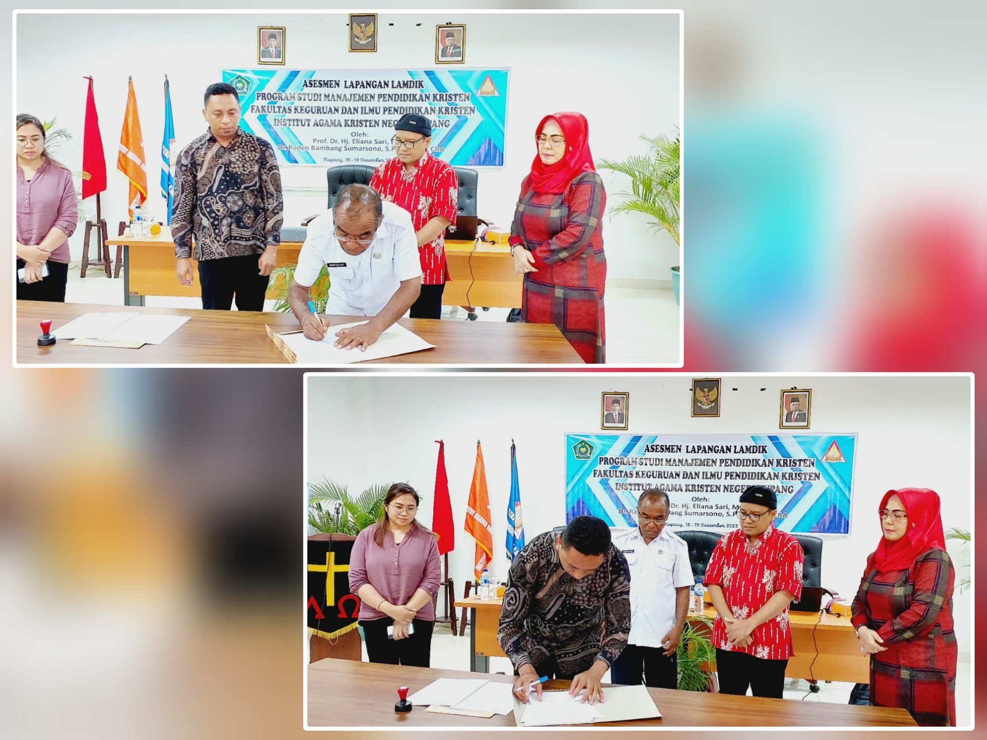 IAKN Kupang (Kemenag) – – – Program Studi Manajemen Pendidikan Kristen di bawah Fakultas Keguruan dan Ilmu Pendidikan Kristen, Institut Agama Kristen Negeri (IAKN) Kupang, meraih prestasi gemilang setelah berhasil mendapatkan akreditasi “Baik” dari Lembaga Akreditasi Mandiri Kependidikan (LAMDIK). Keberhasilan ini diumumkan pada Jumat (05/01/2024) setelah tim asesor LAMDIK melakukan asesmen lapangan pada bulan desember selama dua hari, mulai dari Senin (18/12/2023) hingga Selasa (19/12/2023).