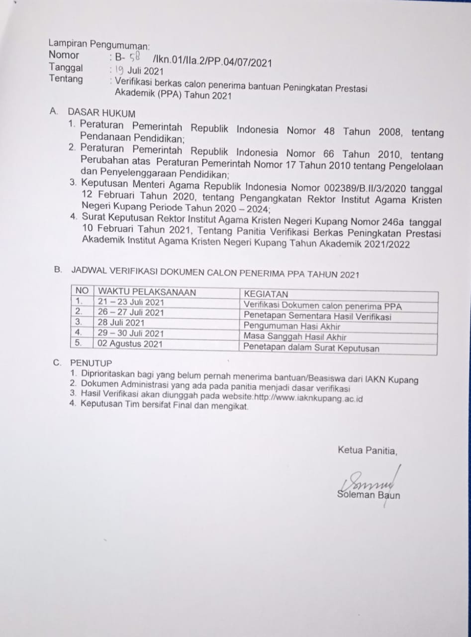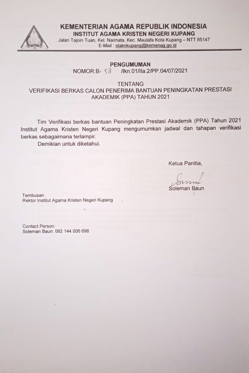 Verifikasi Berkas Calon Penerima Bantuan PPA Tahun 2021 19 Juli 2021 08:44 WITA | IAKN Kupang | Acara & Tulisan Ilmiah Previous Next Silakan Ikuti IAKN Kupang di Social Media Post navigation Sebelumnya: Jadwal Pelaksanaan Ujian Tertulis Penerimaan Mahasiswa Baru Jalur Mandiri IAKN Kupang 2021Selanjutnya: Pengumuman Perubahan Pelaksanaan Tes Tertulis PMB Mahasiswa Baru Jalur Mandiri IAKN Kupang 2021 Acara & Tulisan Ilmiah Lainnya IAKN Kupang Gelar Ibadah Awal Pekan: Ajak Civitas Akademika Renungkan Orientasi Kerja dalam Iman 12/11/2024 Mendorong Inovasi Pendidikan: Arahan Dekan FKIPK di Apel Pagi Jadi Sorotan 24/10/2024 Apel Kesadaran di Lingkup IAKN Kupang, Rektor Tekankan Disiplin dan Komitmen dalam Melaksanakan Tanggung Jawab 19/10/2024 MEMOTRET HARI INI, MEMBIDIK MASA DEPAN: Membaca Perubahan Mentalitas. Oleh: I Made Suardana 08/10/2024 Apel Pagi IAKN Kupang: Semangat Baru Menuju Masa Depan Gemilang 02/10/2024 Rektor IAKN Kupang : “Masa Depan dan Harapan Harus Dikerjakan Hari Ini untuk Esok yang Lebih Baik” 09/09/2024 Plt. WR I, Marla M. Djami, M.Si Tekankan Pentingnya Persiapan Akademik dalam Arahan Apel Pagi IAKN Kupang 09/09/2024 Call For Paper Tingkat Nasional 04/09/2024 Plt. Dekan FISKK IAKN Kupang Tegaskan Persiapan Kegiatan Akademik dan Kegiatan Kampus di Apel Pagi 03/09/2024 Apel Pagi Pada Senin, 19 Agustus 2024: Kepala Biro AUAK Dorong Keaktifan dalam Kepanitiaan 19/08/2024 Kategori Acara & Tulisan IlmiahBerita KampusSEKILAS IAKN KUPANG Berita Terbaru IAKN Kupang Gelar Ibadah Awal Pekan: Ajak Civitas Akademika Renungkan Orientasi Kerja dalam Iman 12/11/2024 Acara & Tulisan Ilmiah Baca selengkapnya Dekan FISKK IAKN Kupang Ajak Civitas Akademika Jaga Produktivitas dan Sinergi dalam Pelayanan 12/11/2024 Berita Kampus Baca selengkapnya IAKN Kupang Gelar Upacara Hari Pahlawan, Ajak Civitas Akademika Teladani Semangat Kepahlawanan 12/11/2024 Berita Kampus Baca selengkapnya IAKN Kupang Perkuat Kolaborasi Pendidikan Internasional dengan Taiwan 12/11/2024 Berita Kampus Baca selengkapnya